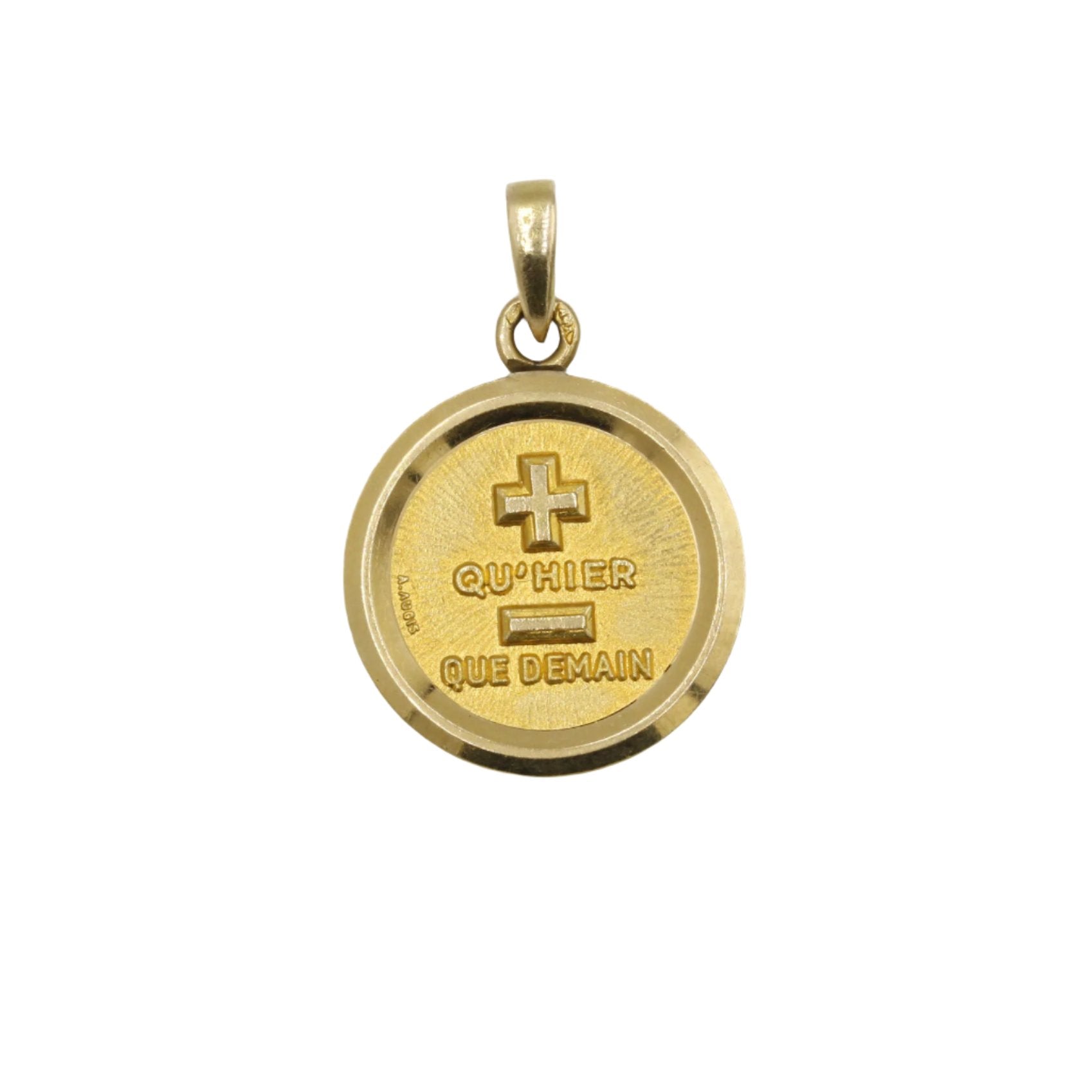 Médaille d'amour Augis "+ qu'hier - que demain" en or jaune 750‰. Dimensions : 1,8 x 2,7 cm Poids : 3,08 grs