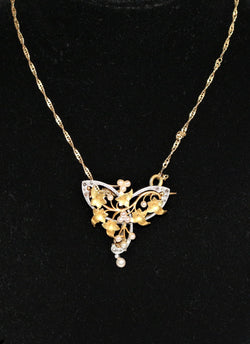 Broche ou pendentif d’époque Art Nouveau (1900) au décor végétal2 ors (jaune et blanc 750/1000e)poinçons : tête d’aigle sur la broche et sur l’épingleformant un décor végétal très raffiné avec petites perles, et petits diamants taille rose (18 en tout) : les plus gros ont été vérifiéspoids brut : 7,81 grdimensions : 3,5 cm / 3,5 cmétat : très beau décor raffiné, en fonction de l’usage que vous souhaitez lui donner, vous pouvez porter le bijou en pendentif : il existe 2 trous d’attache pour faire passer les anneaux ressorts d’une fine chaîne (comme suggéré sur les photos) ou en brocheUne Petite restauration récente a été effectuée pour consolider l'épingle qui maintenant ne bouge plus.ref.430