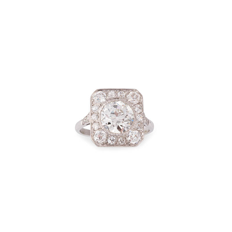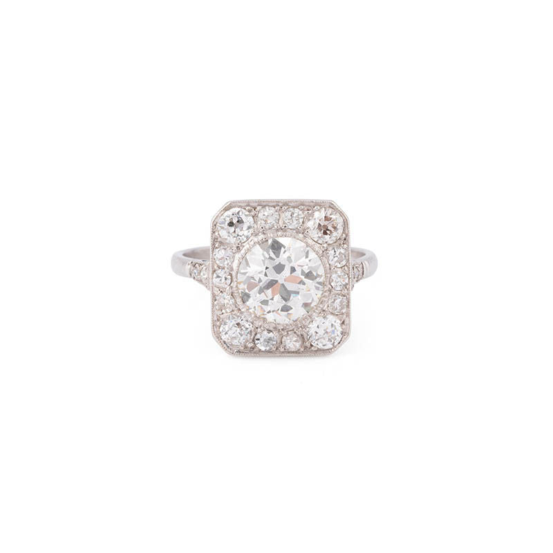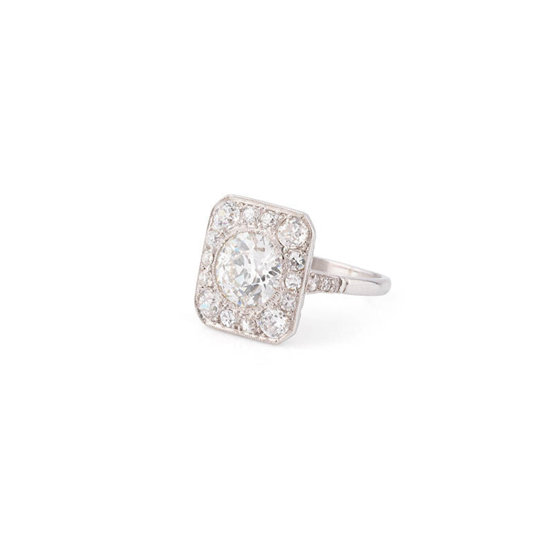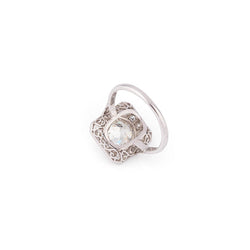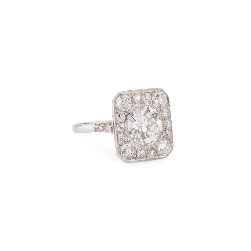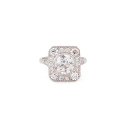 Bague d'époque Art Déco en Platine de forme légèrement rectangulaire sertie au centre d'un important diamant de 1.50 carats et d'un entourage diamants. Poids total: 3,70 grammes. Tour de Doigt: 49 possibilité de mise à la taille (+/_ 4 tailles). Dimension bague: 1,30 x 1,10 cm.