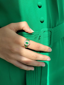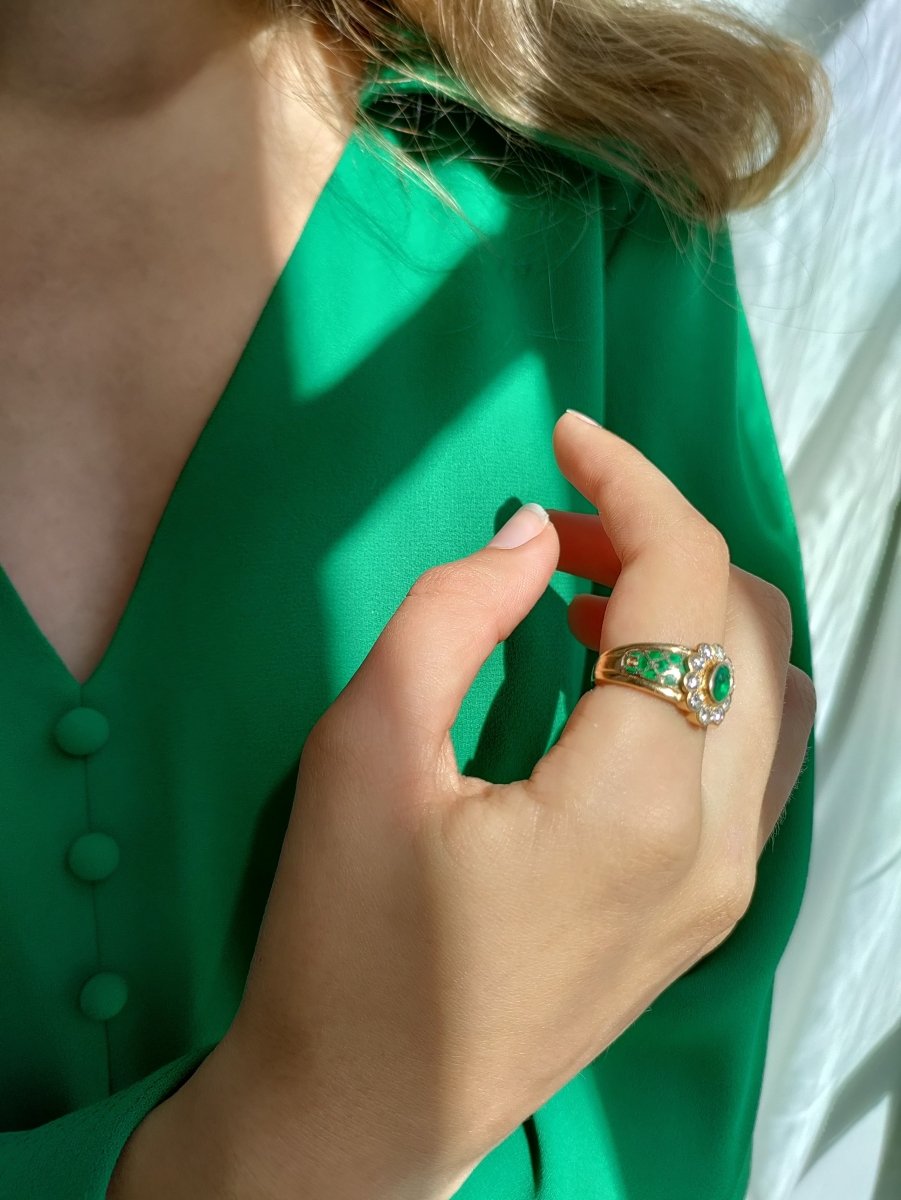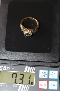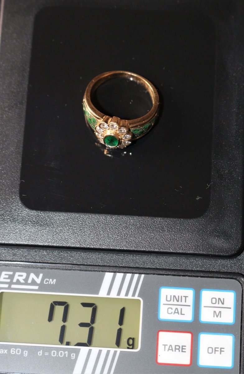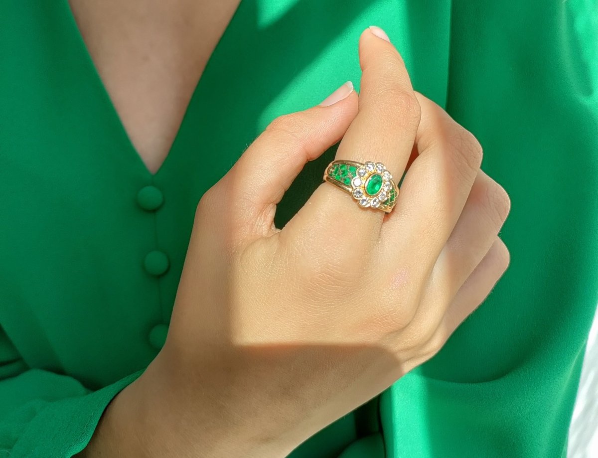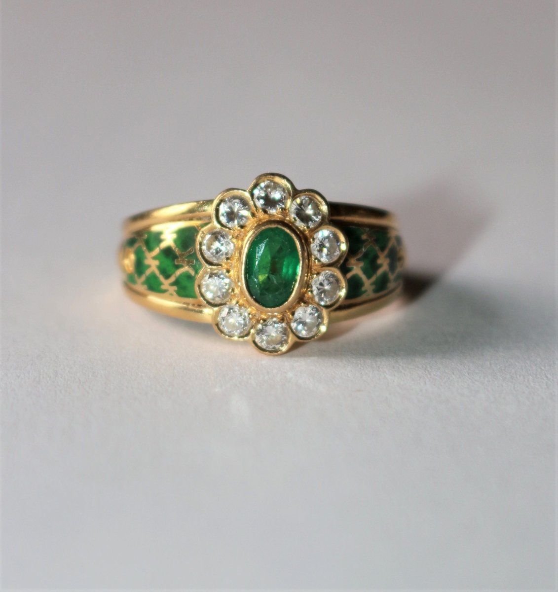 Bague Korloff, collection "Enamel", marguerite composée d'une émeraude et de 10 diamants taille brillant, en serti clos, entourage en émail vert avec logo de la marque 2K adossés inversésEmeraude de 0,20 ct environ + 10 brillants pour un total de 0,40 ct environdimensions : motif principal d'1 cm / 1,4 cm environpoids brut : 7,31 grtour de doigt : 54état : bon état, micro rayures à l'or, égrisures à l'émeraudepoinçons : de maître-orfèvre Korloff à l'intérieur de l'anneau et poinçon hibou pour or 18 k à l'extérieurref.489