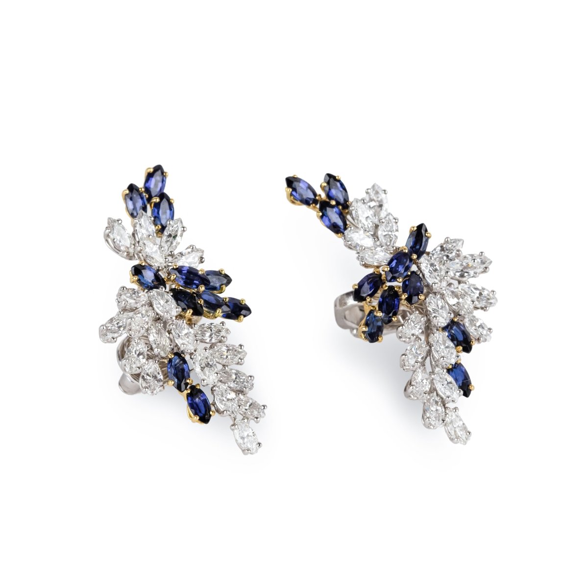Boucles d'oreilles Clip CHAUMET en or blanc et or jaune 18 carats, platine serties de diamants navette et saphirs.