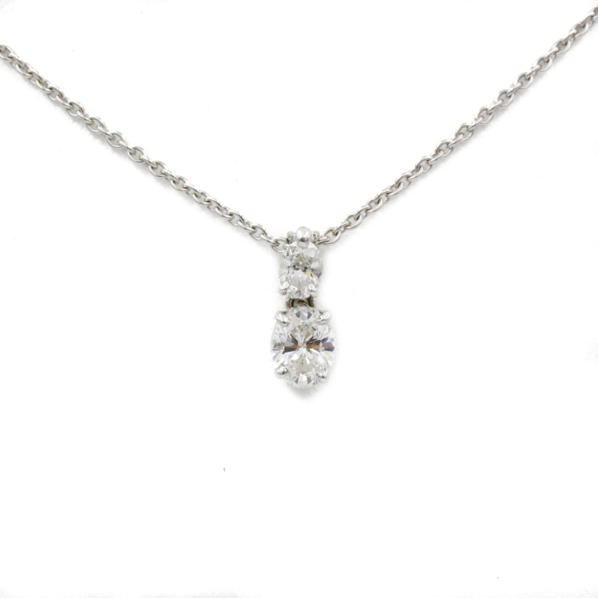 Collier en or blanc 750‰ serti d'un pendentif serti de 2 diamants ovales de 0,60 carat et de 0,20 carat environ F/VS. Longueur : 42 cm Poids : 3,64 grs