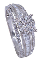 Type bijou : Bague Métal : Or blanc 18 carats (750/1000) Genre : Moderne Poids : 5.4 g Pierre : Diamants taille moderne - Diamants baguettes Poids diamants : 1.30 carat au total environ Taille : 58 - Mise à taille possible, nous consulter Poinçon : Tête d'aigle