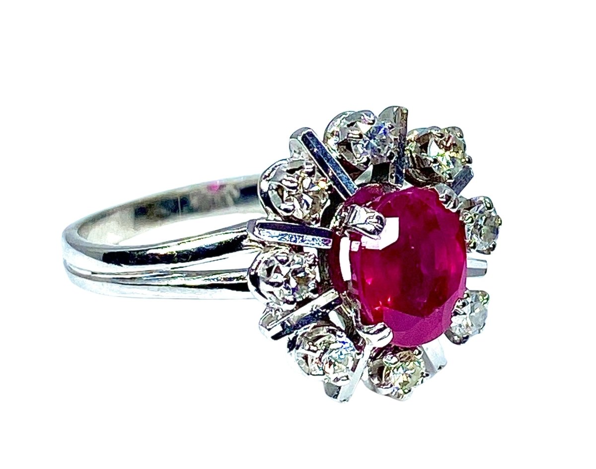 Bague marguerite en or blanc 18 carats ornée au centre dun rubis poids : 1 carat environ entouré dec8 diamants poids: 0,40 carat environ. Tres jolie monture décorée de barettes d'or. Parfait état. Poids:4,30 gr Tour de doigt : 50 Dimensions: 13,6 x 13 mm