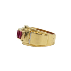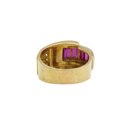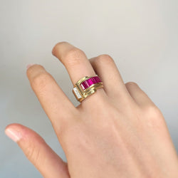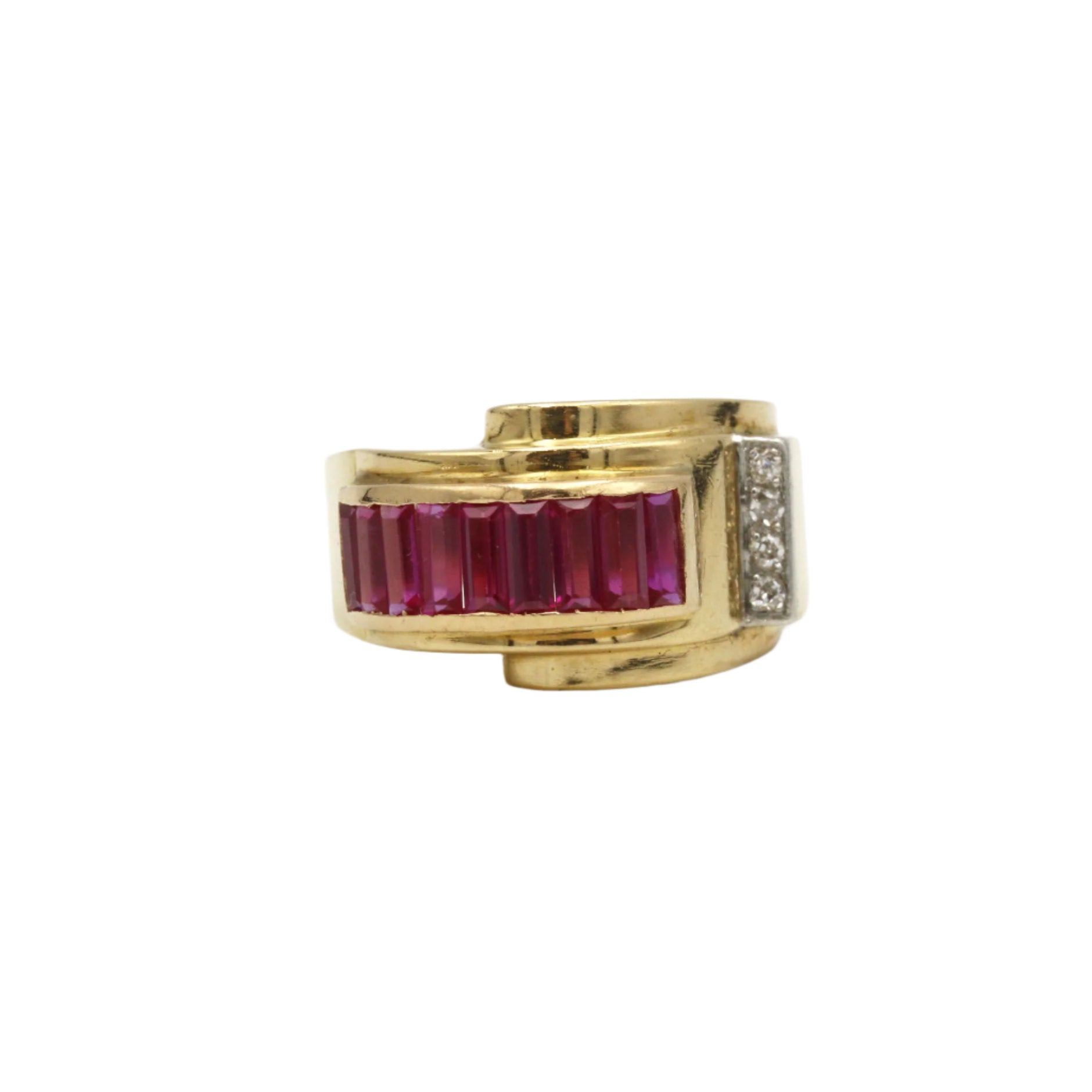 Bague Tank en or jaune 750‰, sertie de 9 rubis synthétiques Verneuil (très courant pendant les années 40-50) calibrées et 4 diamants taille ancienne. Tour de doigt : 57 Mise à taille possible. Poids : 8,30 grs