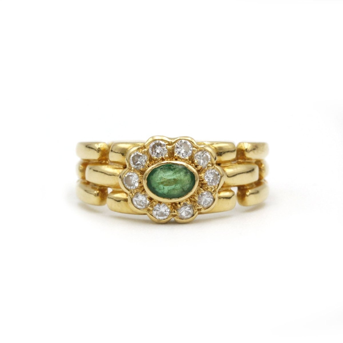 Bague rétro en or 18 carats, sertie d'une émeraude de 0,20 carat environ et de 10 diamants. Tour de doigt : 55 Mise à taille dans la limite du possible. Poids : 4,40 grs