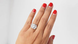Bague ancienne en platine et diamants. Poids total diamants : Diamant central de taille ancienne d'environ 0,70 carat entouré de 14 diamants pour un poids total d'environ 0,90 carat Poids total : 6,57 g Tour de doigt : 56 Poinçon : Mascaron Dimensions plateau : 13,50x15 mm Époque : années 30