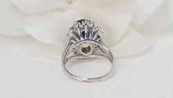 Bague entourage ; Or blanc 18 kt/750 millièmes ; Sertie au centre d'un saphir ovale d'environ 6cts ; Entourage de diamants taille brillant pour un total d'environ 0,35ct; Poids : 6gr ; Tour de doigt : 49(modifiable) ;