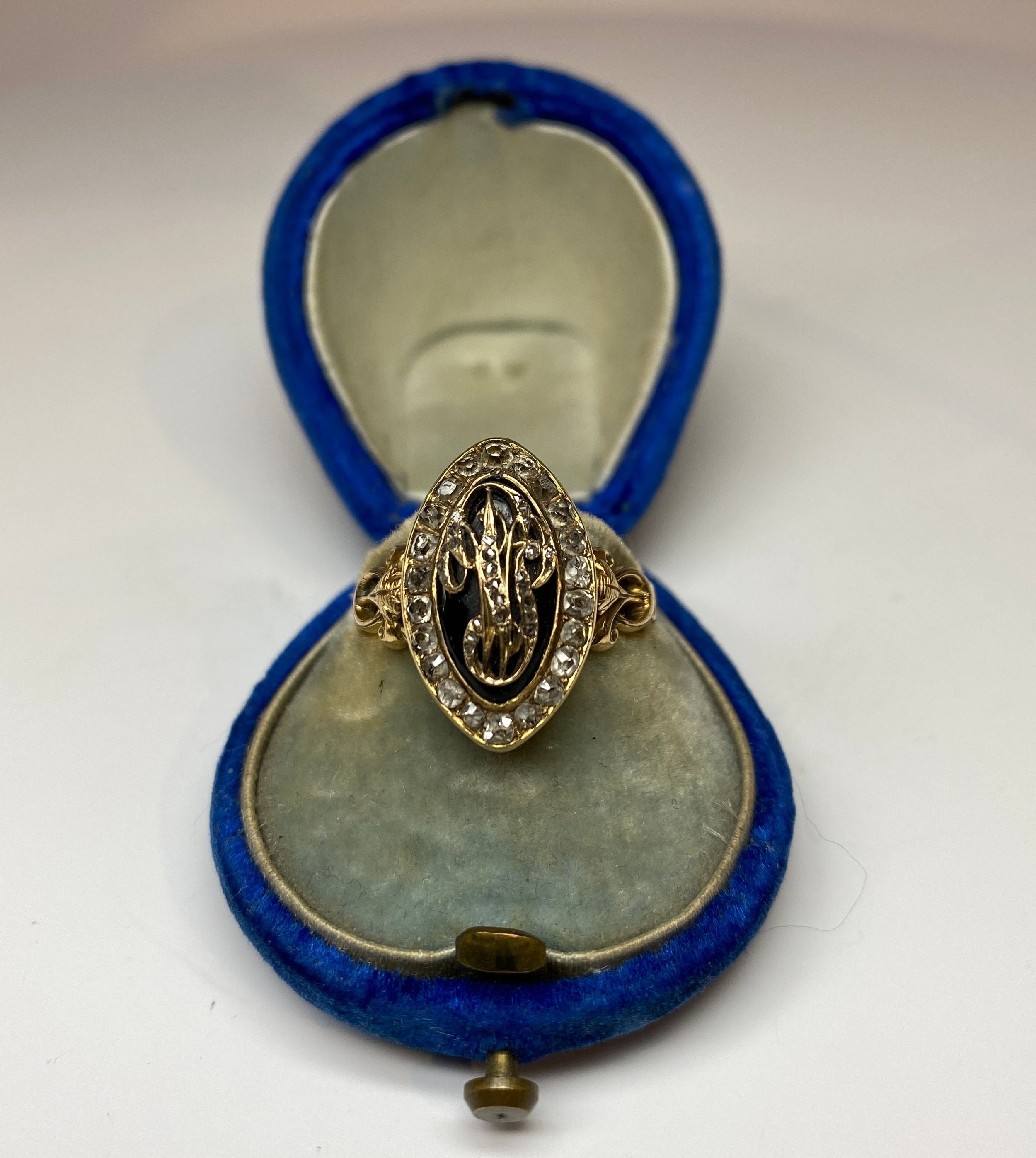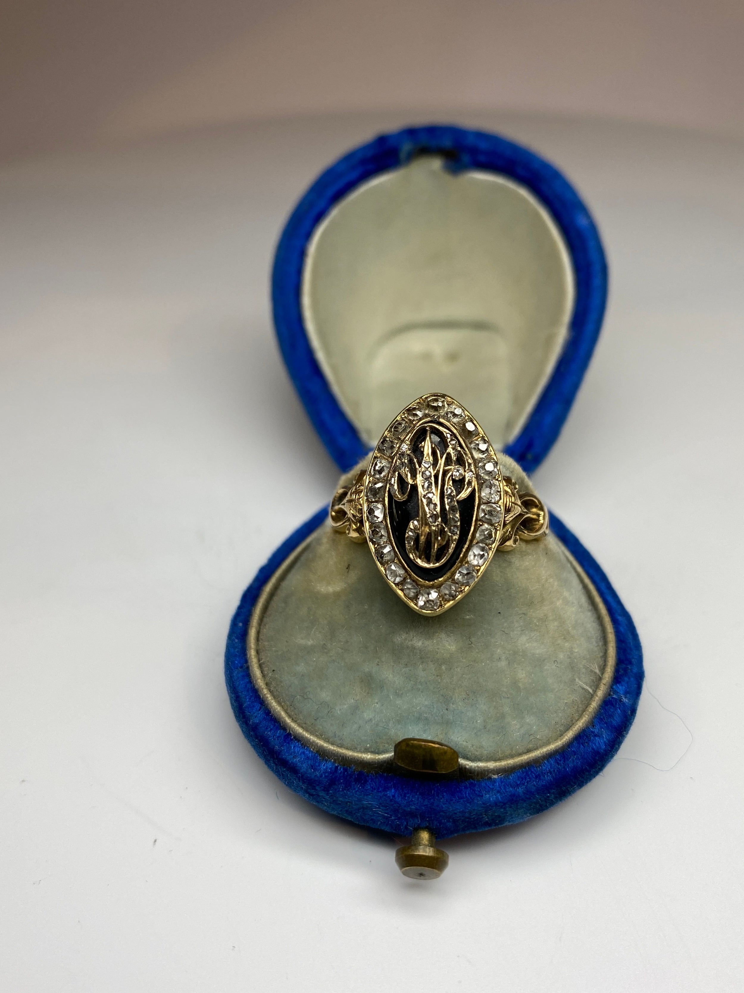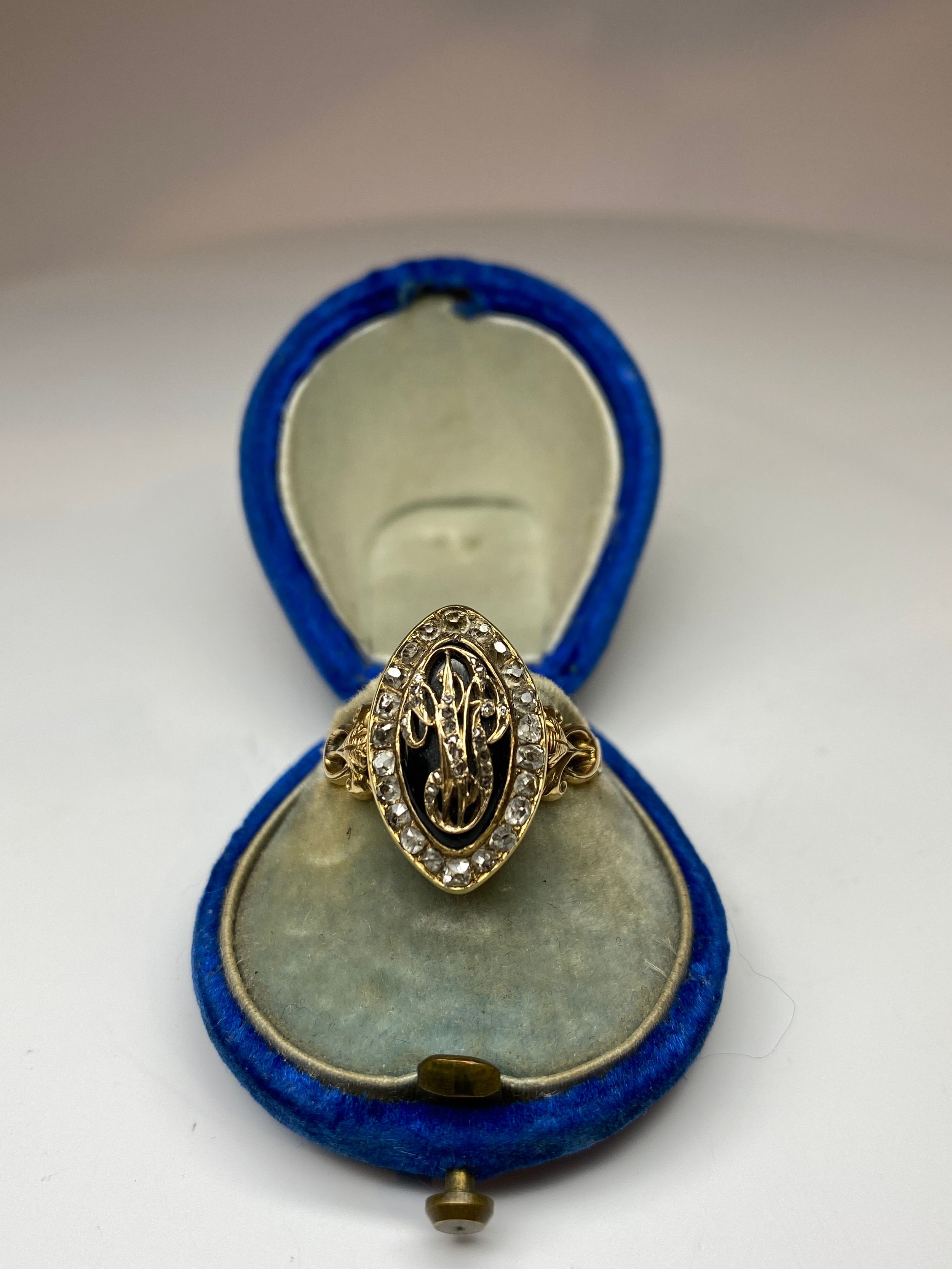Bague en or 18 carats de forme marquise ornée sur le dessus d'une double initiales en or serties de diamants taillés en rose sur une base en émail bleu, l'ensemble dans un entourage de diamants taillés en rose.