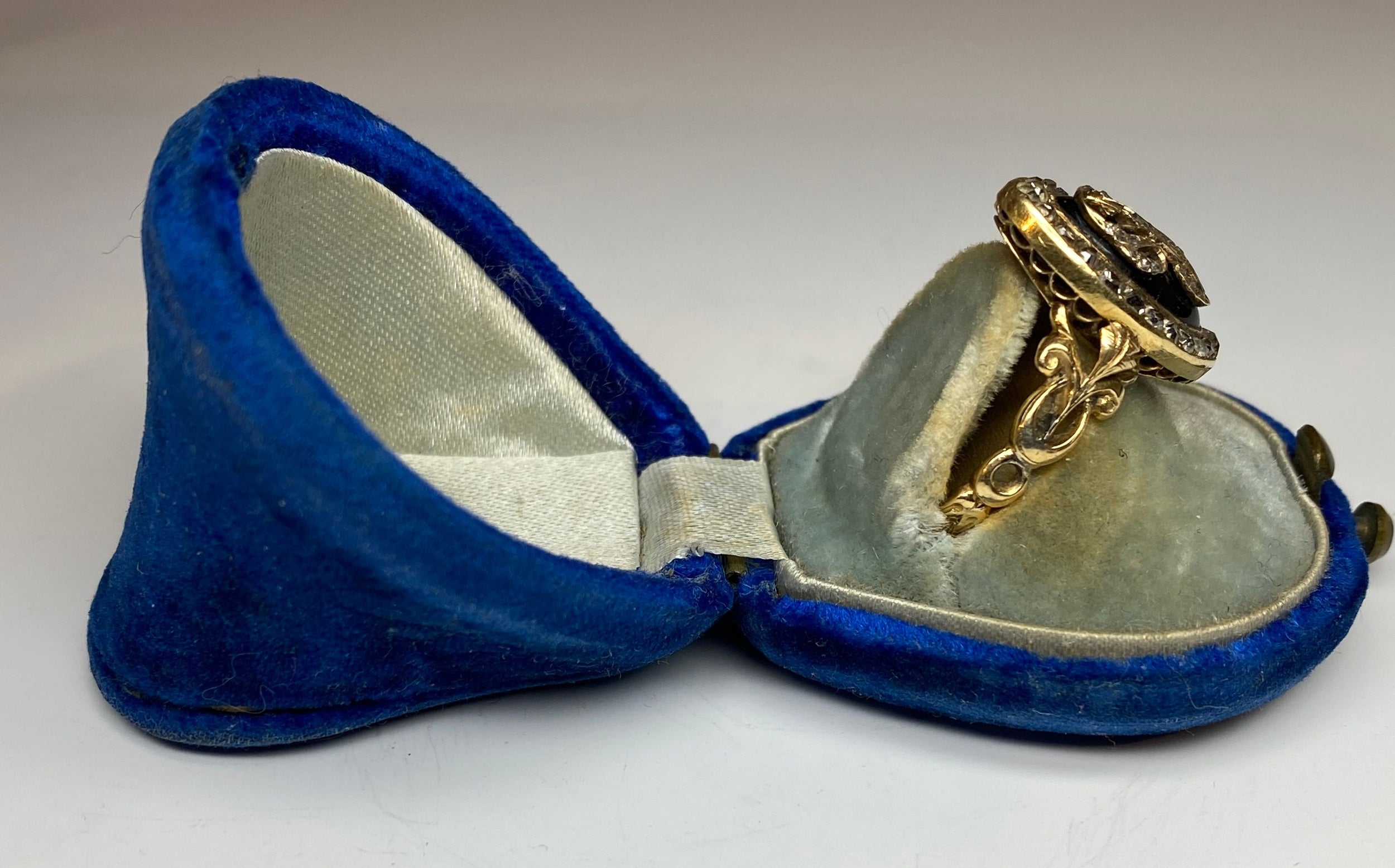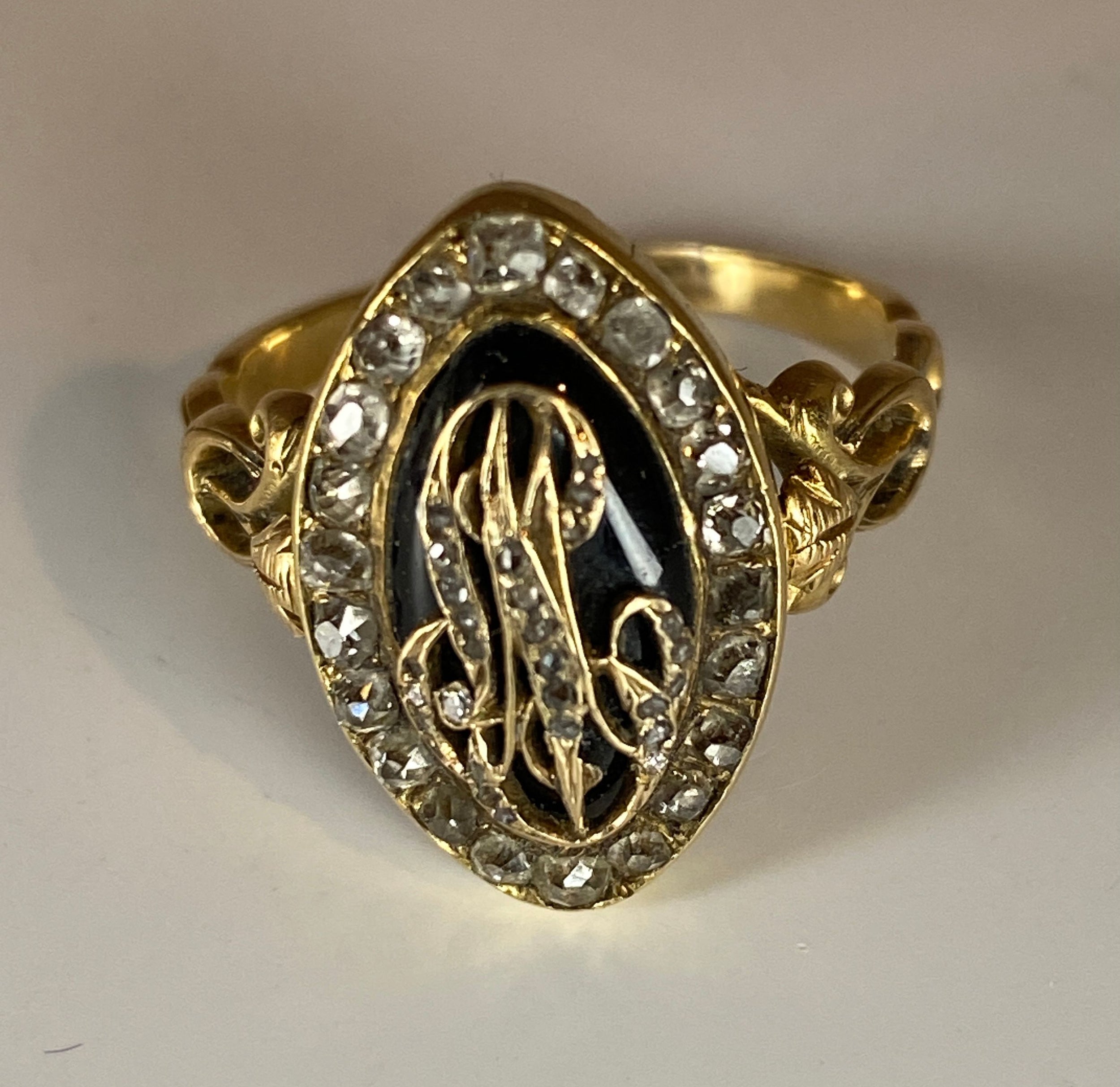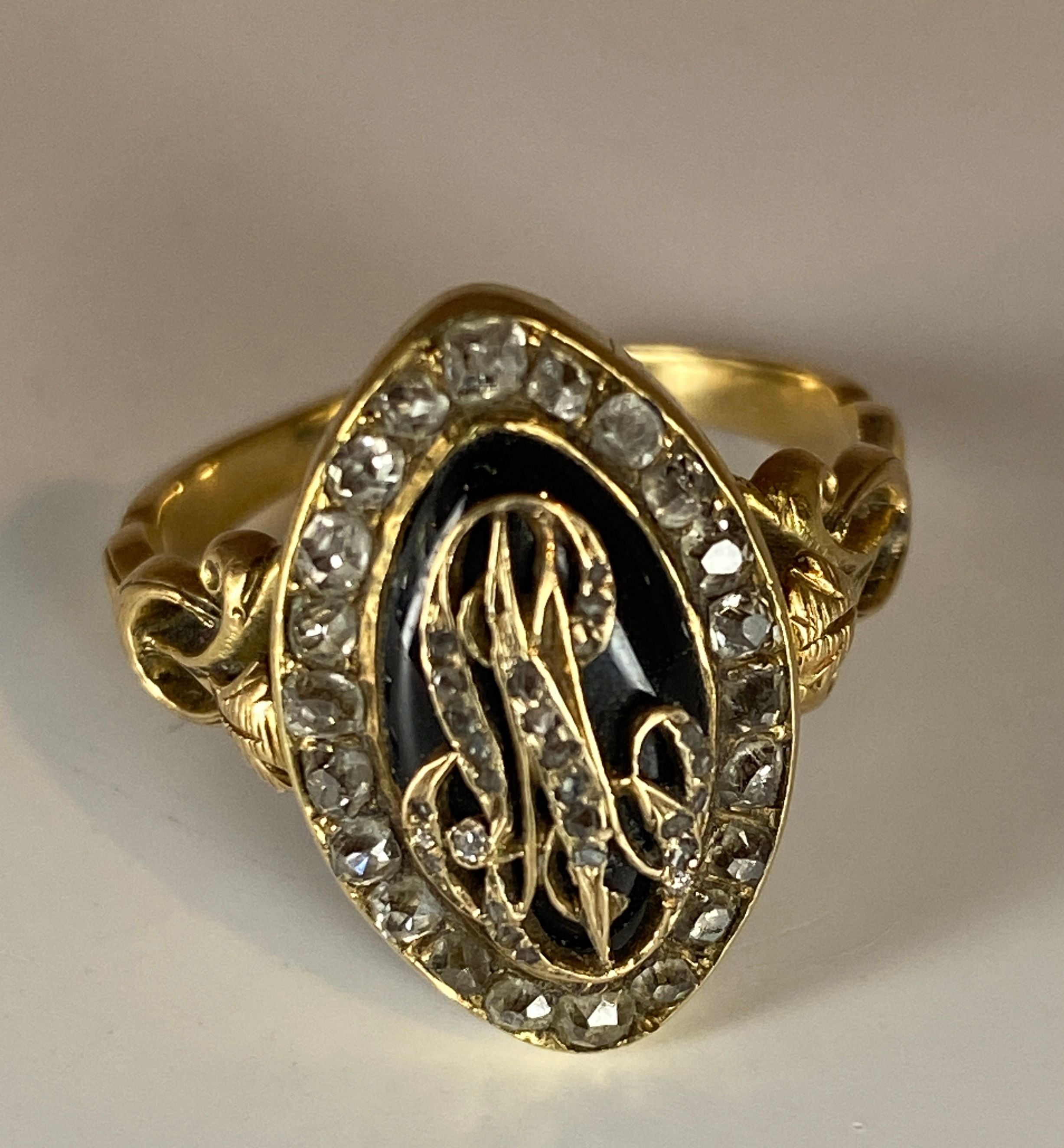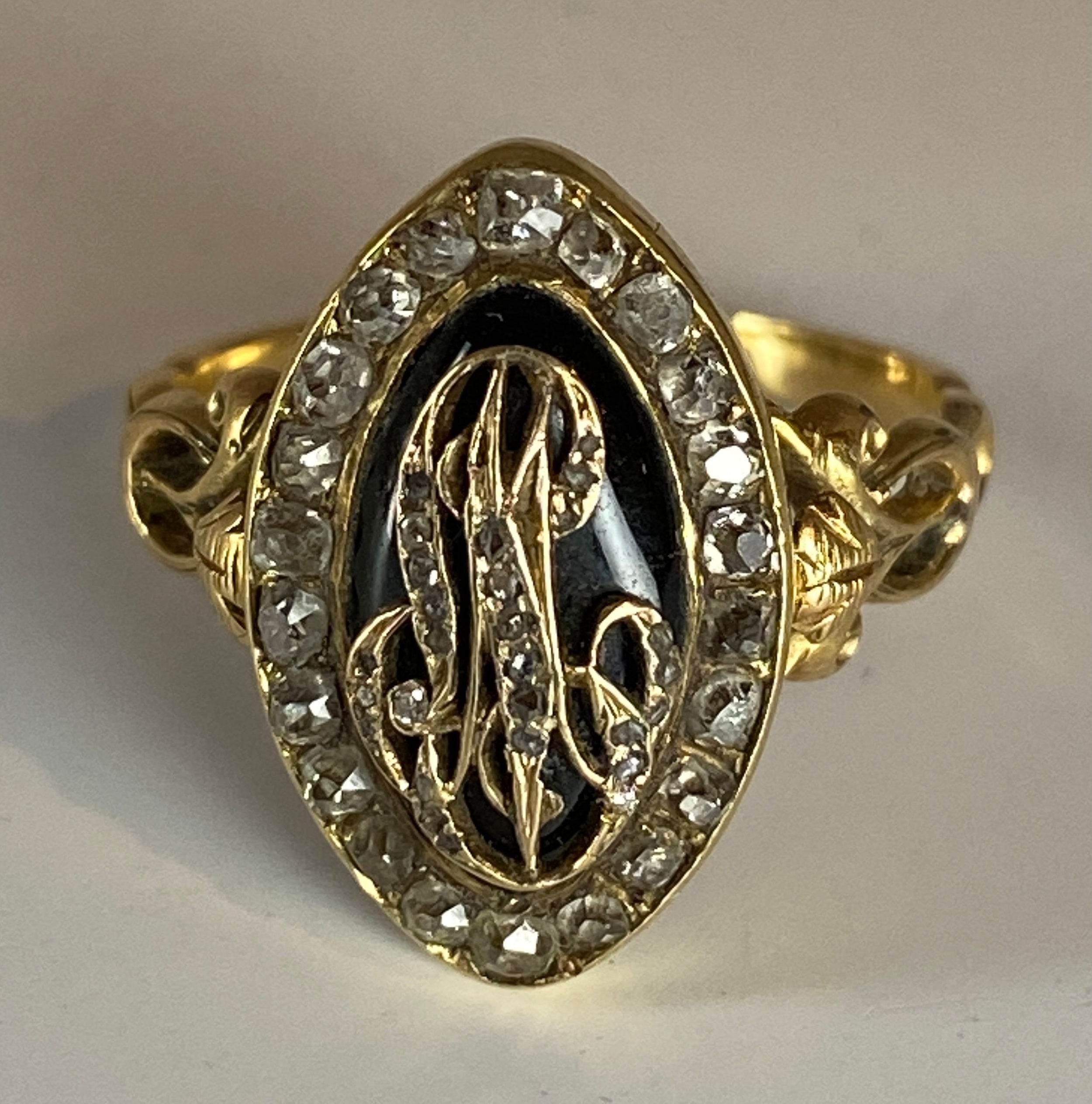 Bague en or 18 carats de forme marquise ornée sur le dessus d'une double initiales en or serties de diamants taillés en rose sur une base en émail bleu, l'ensemble dans un entourage de diamants taillés en rose.