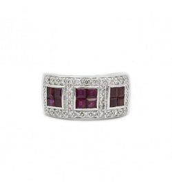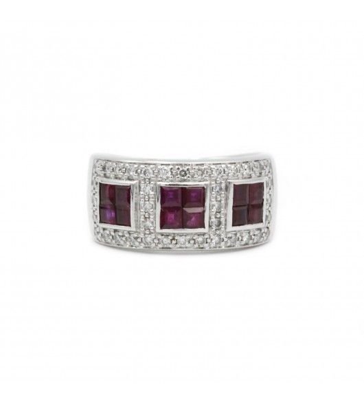 Bague en or blanc 750. sertie de 38 diamants (0.30 carat environ) et de 12 petits rubis calibrés.Tour de doigt : 53Mise à taille impossible.