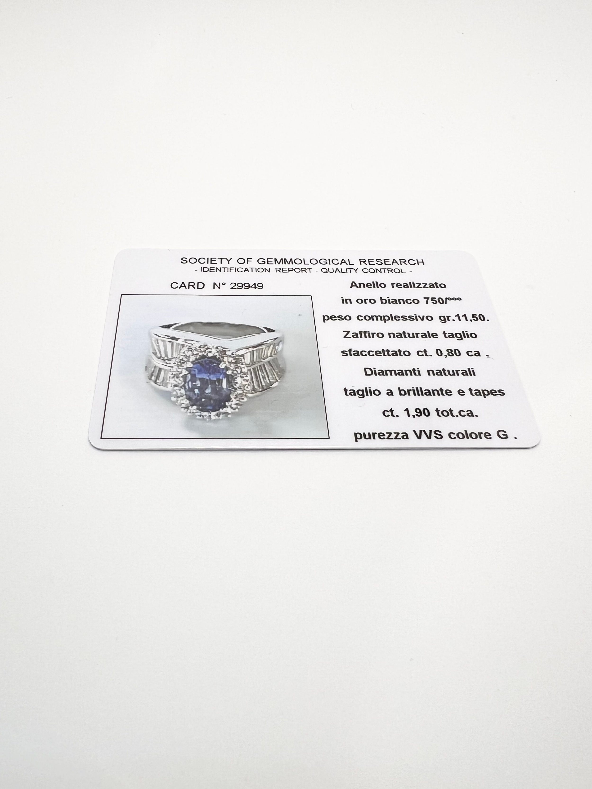 Bague en or blanc 18 carats, ornée de diamants naturels taille brillant et baguette, et d'un saphir naturel taille facettée de 0,80 carat.