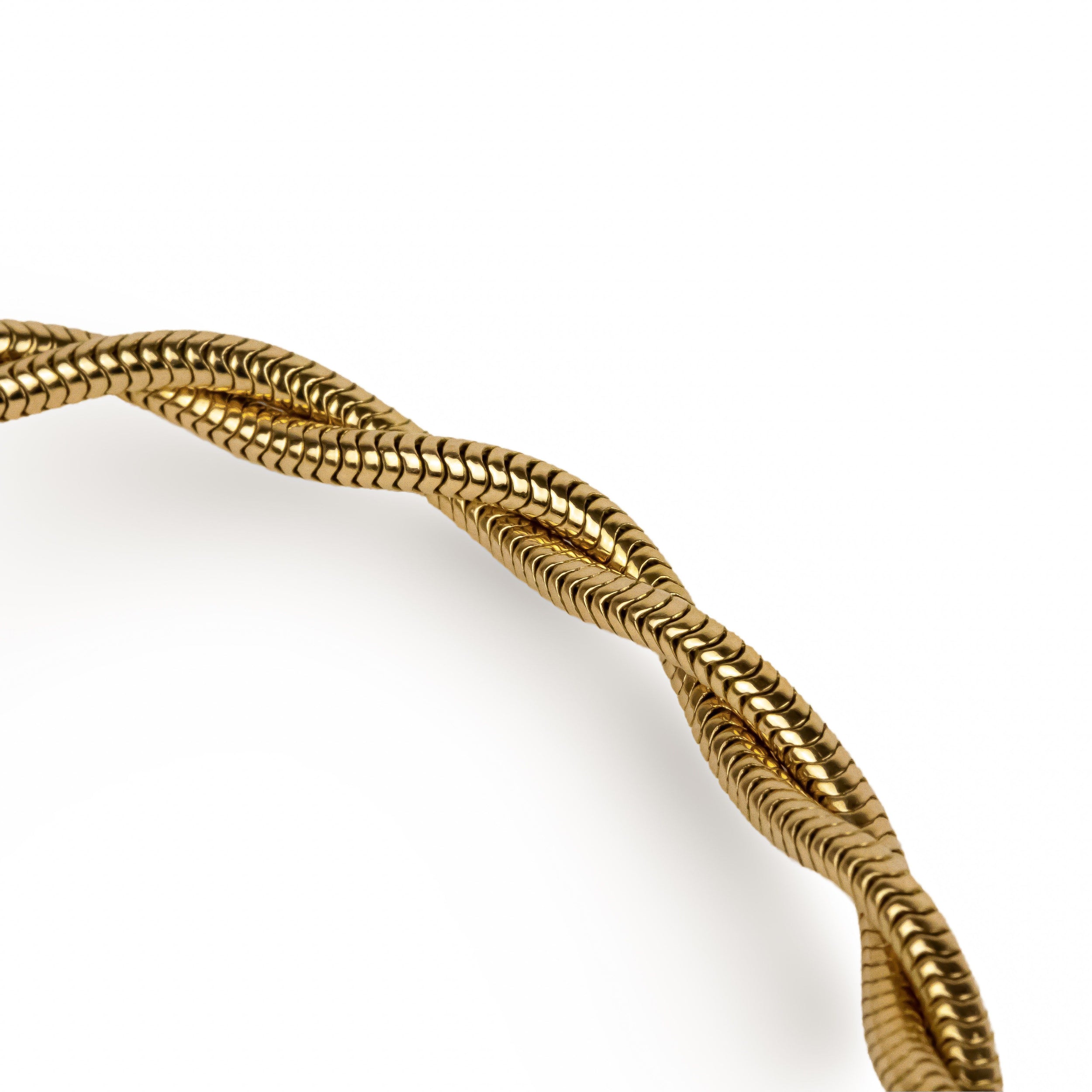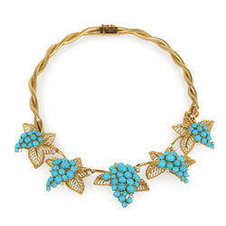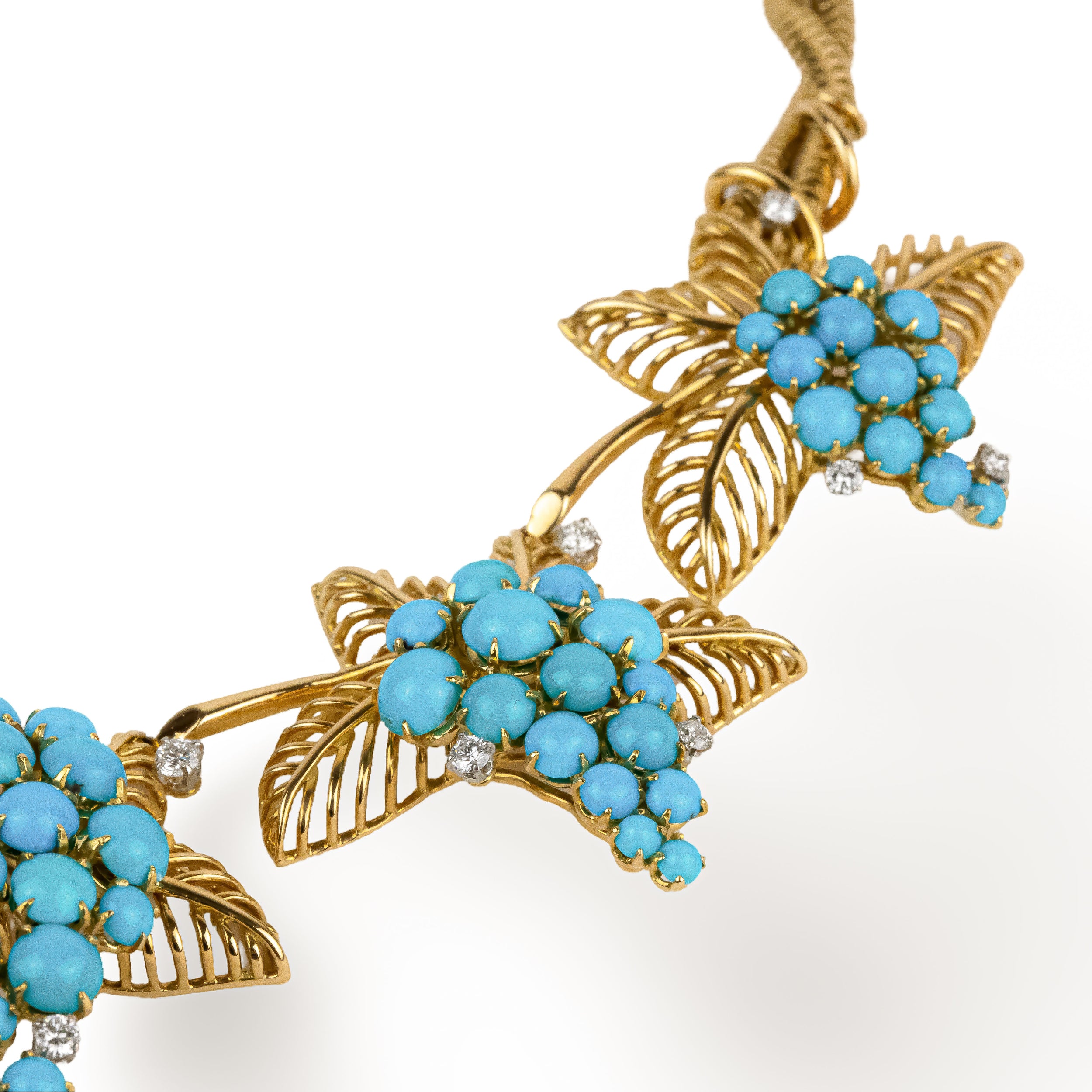 Collier BOUCHERON tubogaz torsadé en or jaune 18 carats (750/1000), retenant cinq motifs de vigne en turquoises et diamants. Signé BOUCHERON Paris et numéroté. Circa 1950.