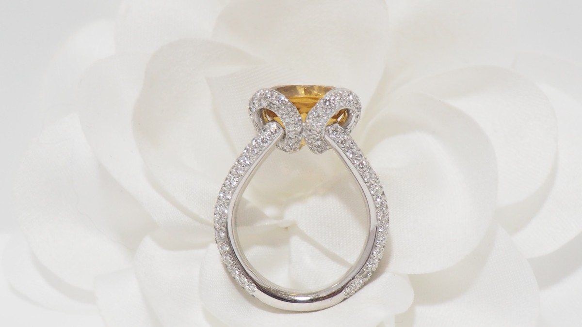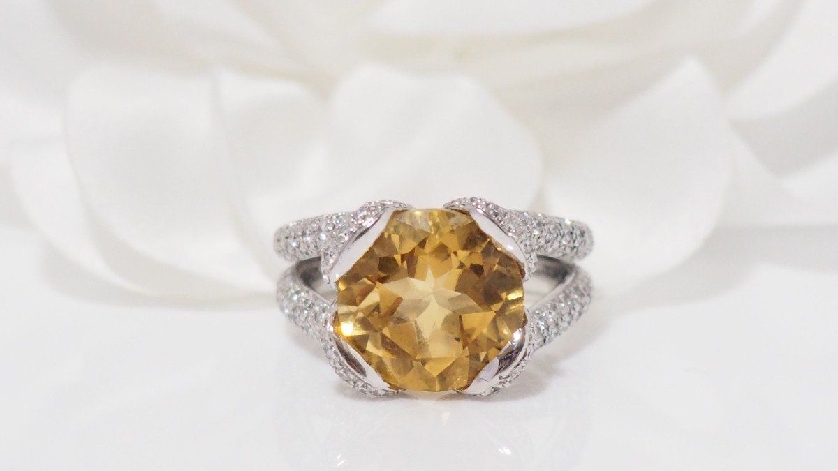 Bague en or blanc 18kt/750millièmes ; Centrée d'une citrine d'environ 5,8cts ; Les griffes formées de volutes pavées de diamants, pour un poids total d'environ 3cts ;; L'anneau est composé de deux fils d'or ; Poids : 12,40gr ; Taille : 53,5.