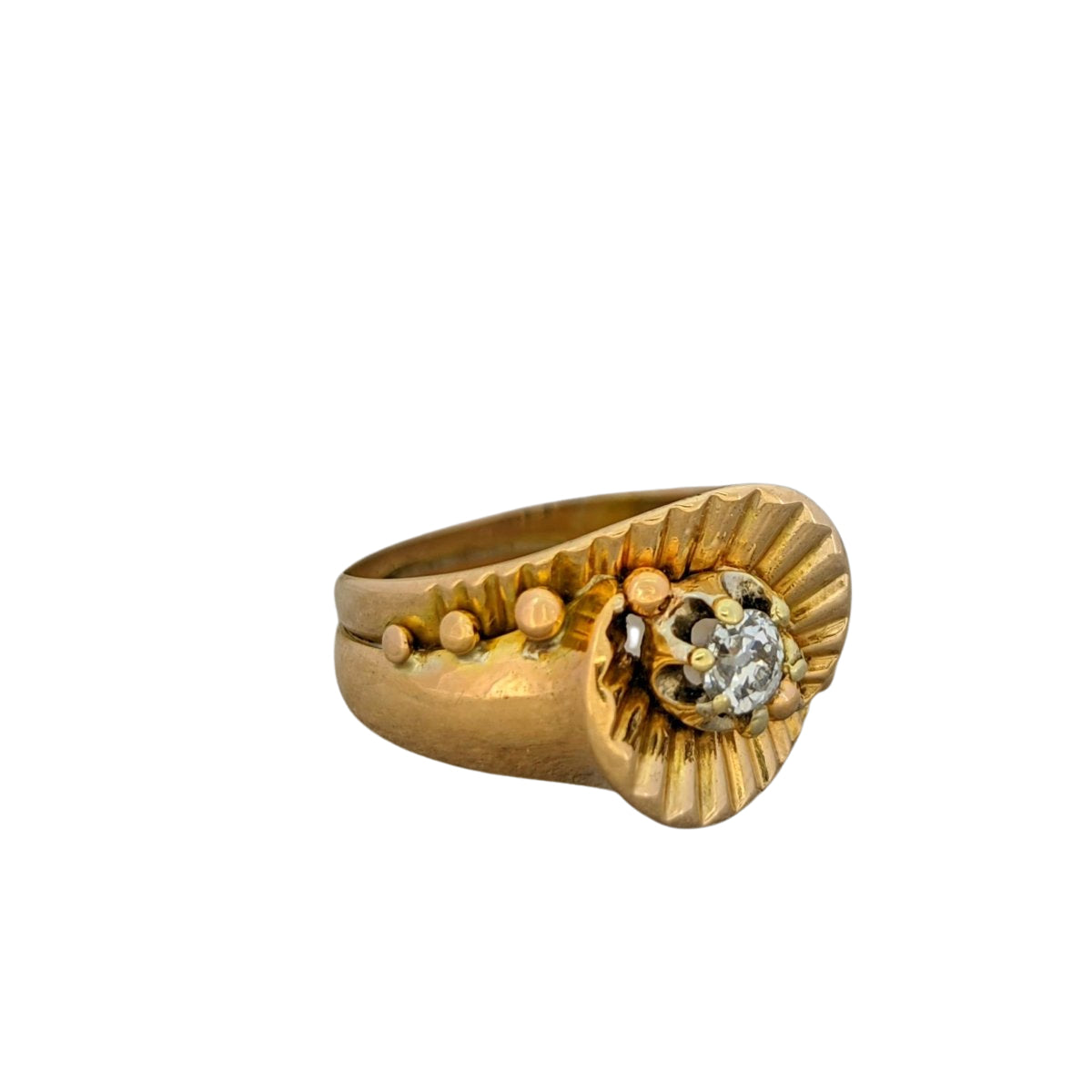 Bague en or jaune et diamant 18 carats - 750 millièmes Poids brut: 5,96gr Tour de doigt 52 mm Diamant central d'environ 3,8 mm Largeur du haut de bague 12 mm