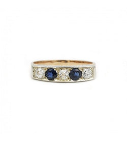 Bague en or jaune 750. sertie de 3 diamants taille ancienne de 0.18 carat chacun environ et de 2 saphirs de 0.25 carat chacun environ.Tour de doigt : 57Mise à taille possible.