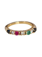 Bague demi-alliance américaine en or jaune 18K serti de 3 diamants de taille brillant pour un total d’environ 0,21ct, et de 2 saphirs, 1 émeraudes, 1 rubis taille poire. Taille de doigt : 51 ( FR ) Poids brut : 3,1 g