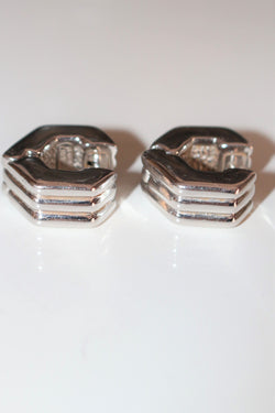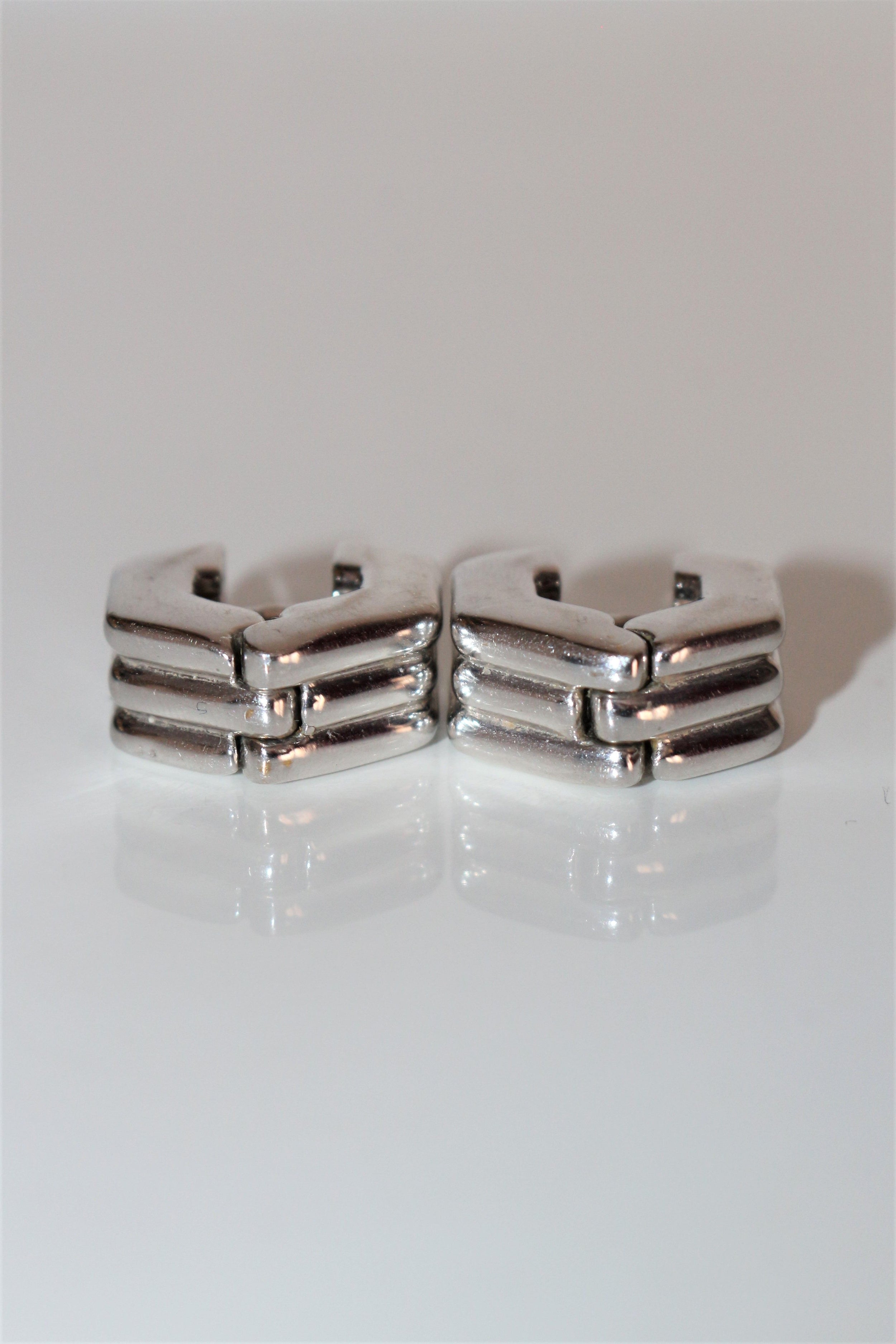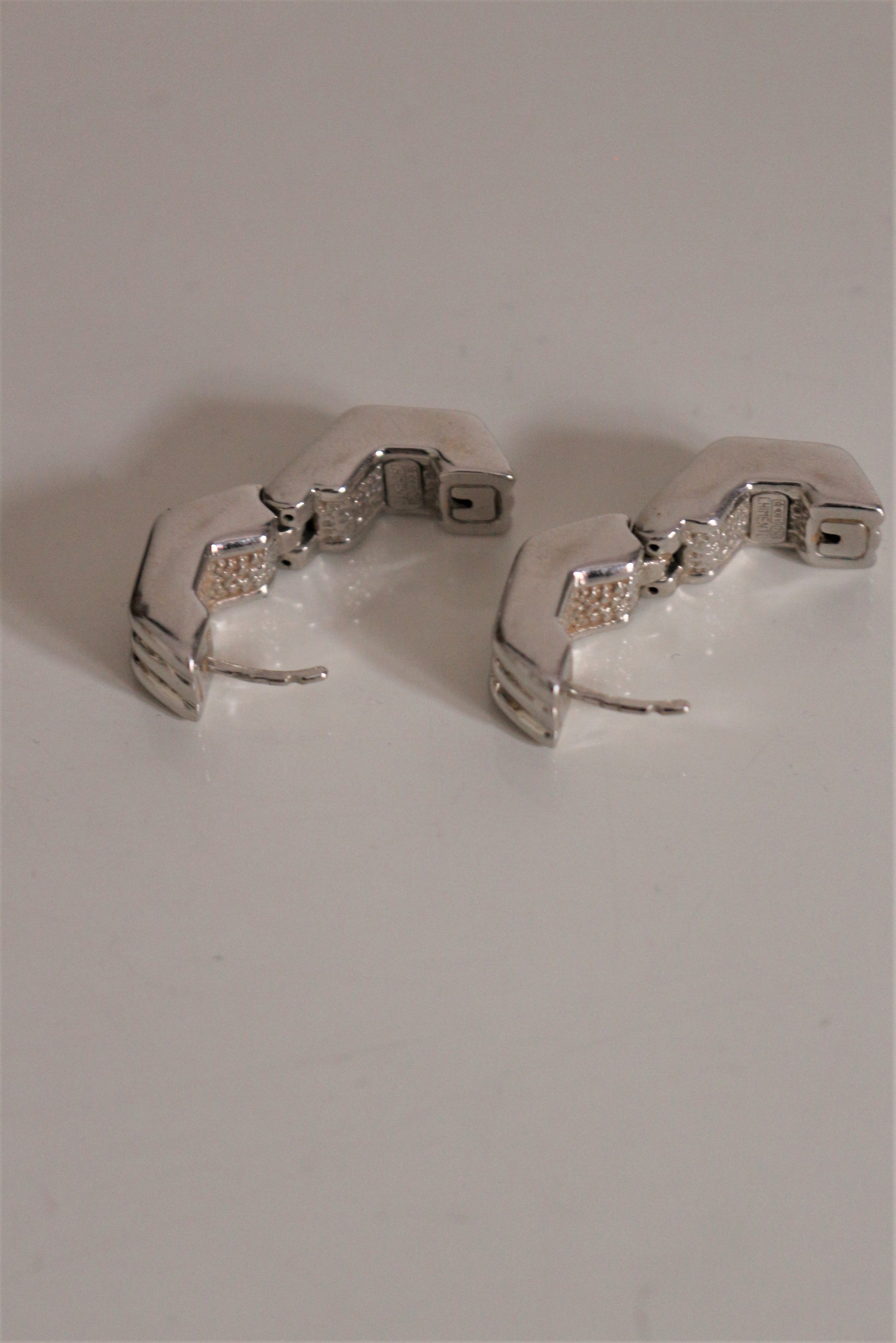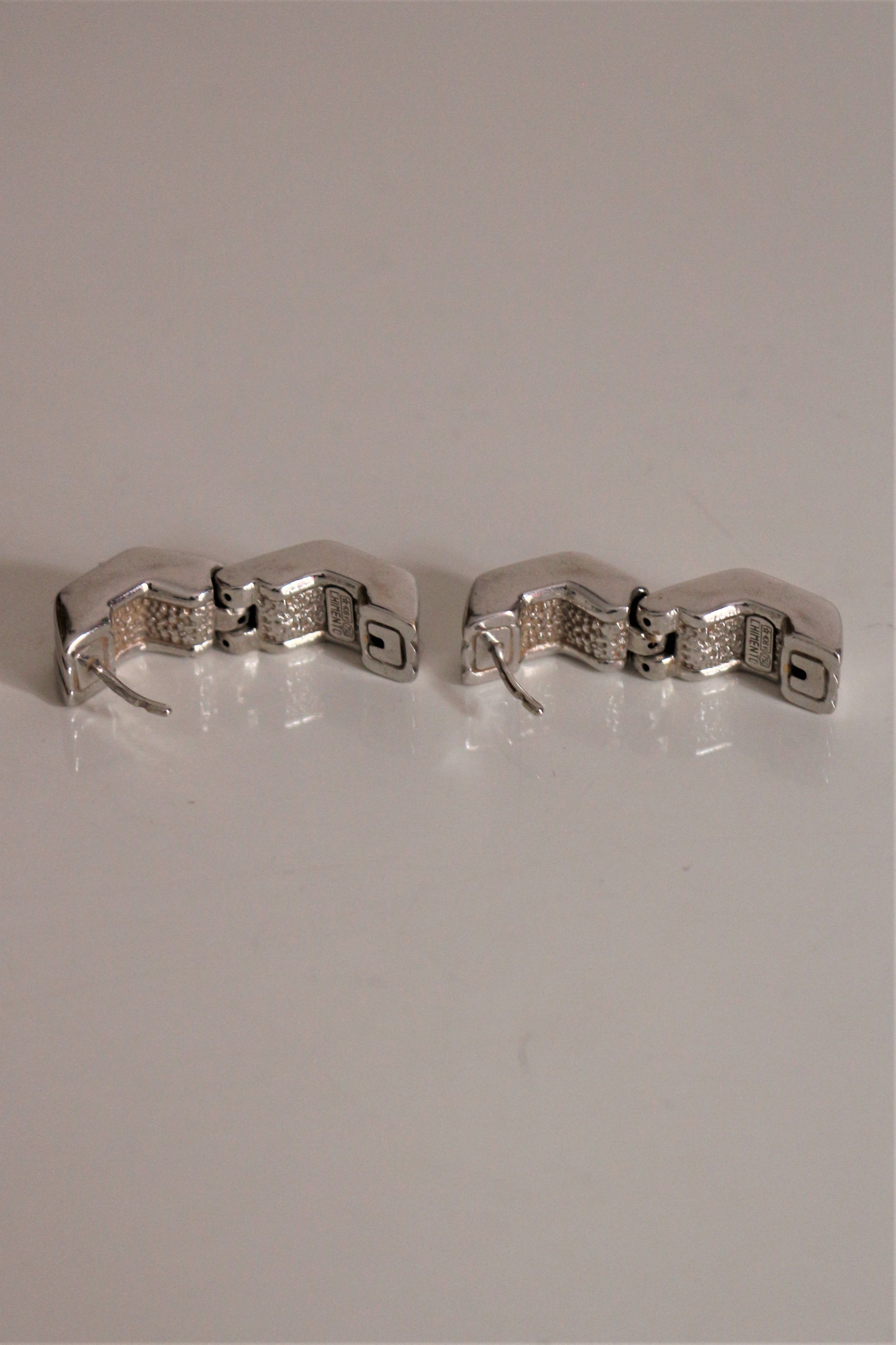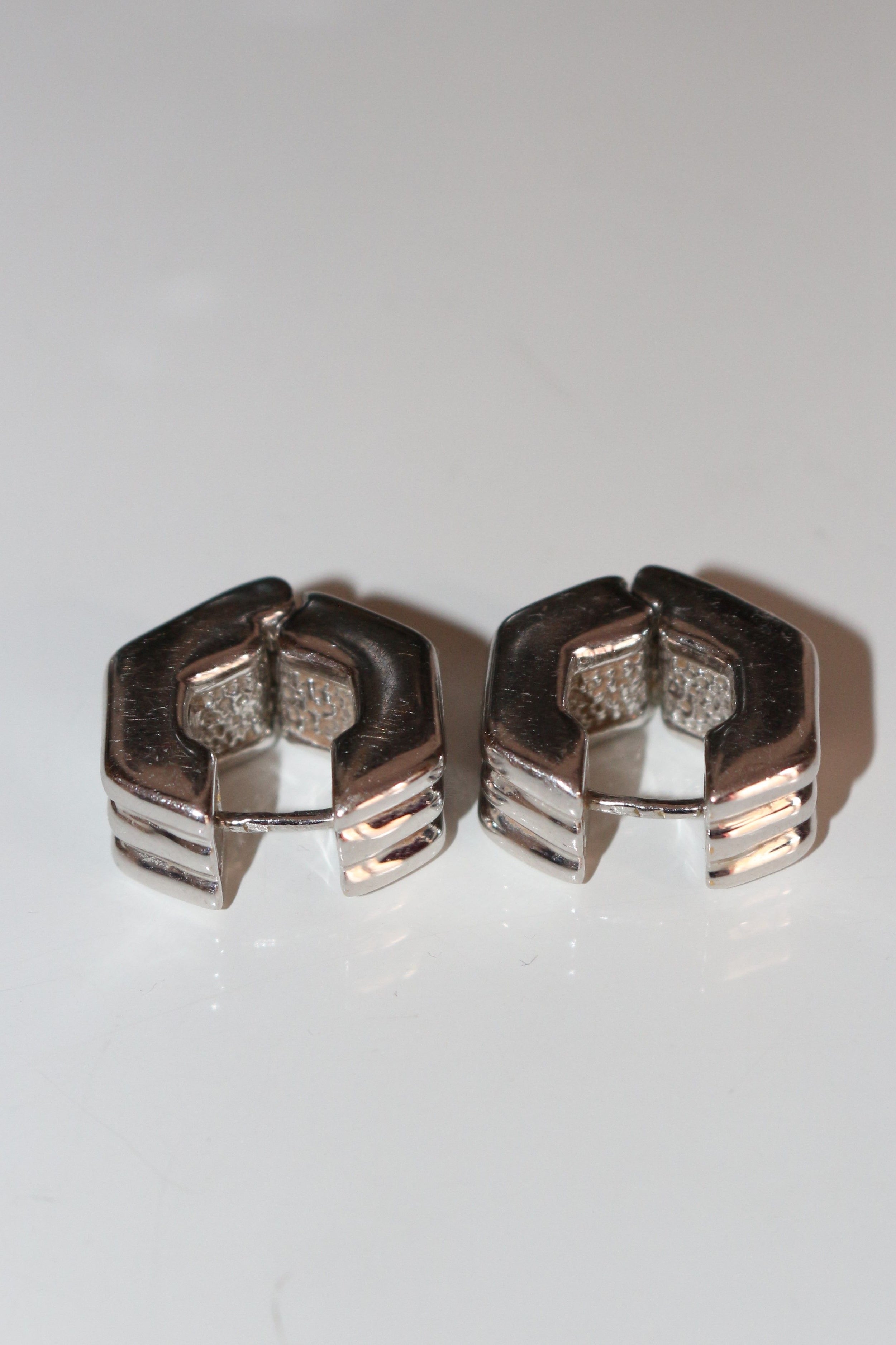 CHIMENTO paire de boucles pour oreilles percées vintage godronnées en or blanc 750/1000e (18k) de forme hexagonalepoids : 6,83 grdimensions : 0,8 cm de large et hauteur : 1,7 cmétat : état correct, ferment très bien, micro-rayures nombreusespoinçons : 2 poinçons tête d'aigle sur chaque tige + signature à l'intérieur de chacune : Chimento 750 + numéro : *408 VIref.296