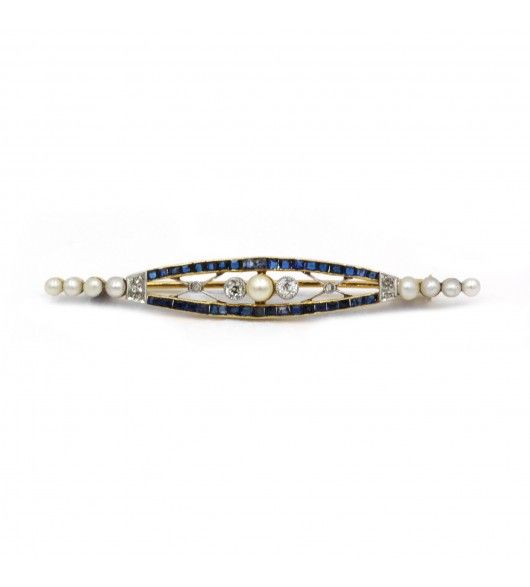 Broche en or 750 et platine 950. sertie de saphirs calibrés. 9 perles blanches. et de 8 diamants.