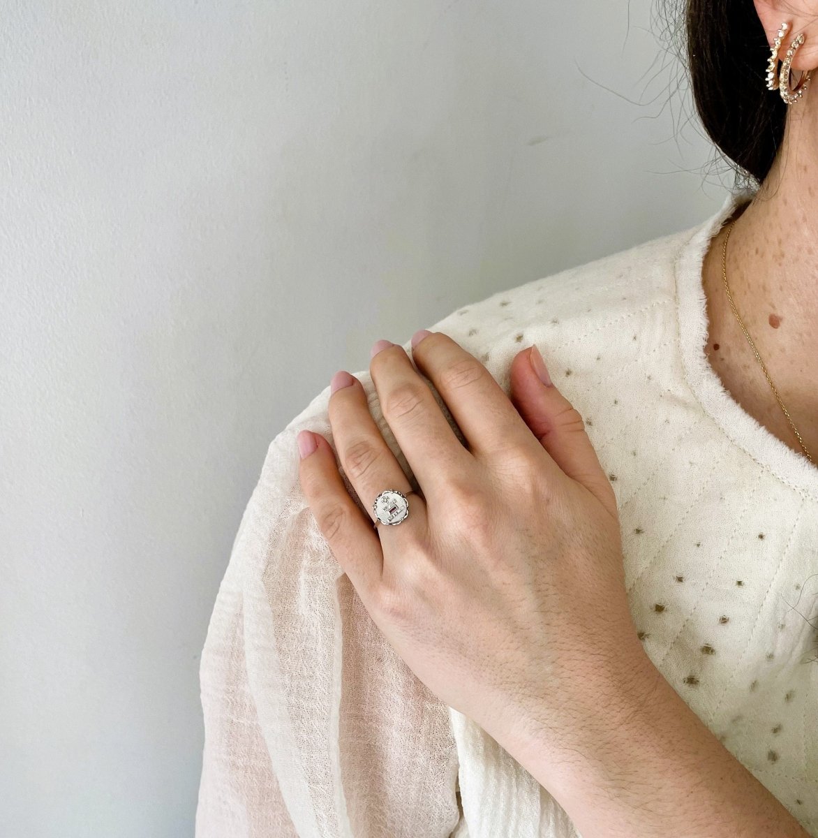 Délicate bague signée Augis, en or blanc 750/1000 (18K) ornée d'une médaille d'amour sertie par 3 griffes sur un panier délicatement ajouré. La médaille à fond rayonnant est réhaussée d'un petit diamant sur le "+" et de deux rubis synthétiques calibrés sur le "-". Dimensions du chaton de bague : 12 mm x 12 mm Tour de doigt : 54 (modifiable) Poids brut : 2,61 g Poinçon Tête d'Aigle et poinçon de maître de la maison Augis.