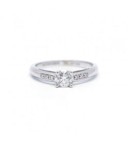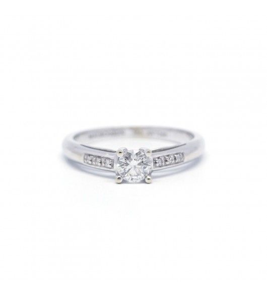 Bague Solitaire signé de la maison MAUBOUSSIN, modèle "Tu es le sel de ma vie", en or blanc 18 carats sertie en son centre d'un diamant de 0.25 carat accompagné de 6 diamants. Tour de doigt: 50 Mise à taille possible de 1 à 2 points maximum