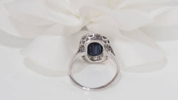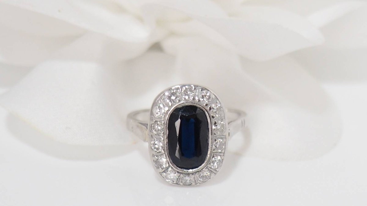 Bague Art Déco ; Platine 900 millièmes ; Sertie au centre d'un saphir ovale de 1,60ct ; Entourage de diamants pour un poids total d'environ 0,30ct ; Poids : 3,60 g ; Taille : 50(modifiable) ; Epoque : années 1930.
