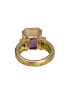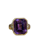 Important bague en or jaune 18K ornée d'une améthyste +/- 11,30 cts taille émeraude en serti clos et 6 diamants taille brillant pour un total d’environ 0,60 ct. Taille de doigt : 55 ( FR ) Poids brut : 14,3 g Poinçons : au 750