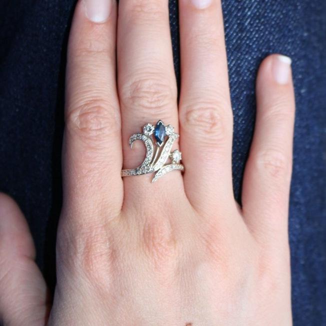 Bague aigrette ancienne en or jaune et or blanc 18 carats, centrée d'un saphir taille navette dans un entourage réhaussé de diamants, 3 taille brillant, 28 taille 8/8 et 7 taille rose. Poinçon losangique de fabrication française à demi-effacé.