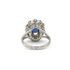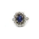 Bague Marguerite en or blanc 750‰ et platine 950‰, sertie d'un saphir naturel (chauffé) d'environ 1,50 carats, accompagnée de 12 diamants. Mise à taille possible. Poids : 4,80 grs