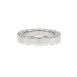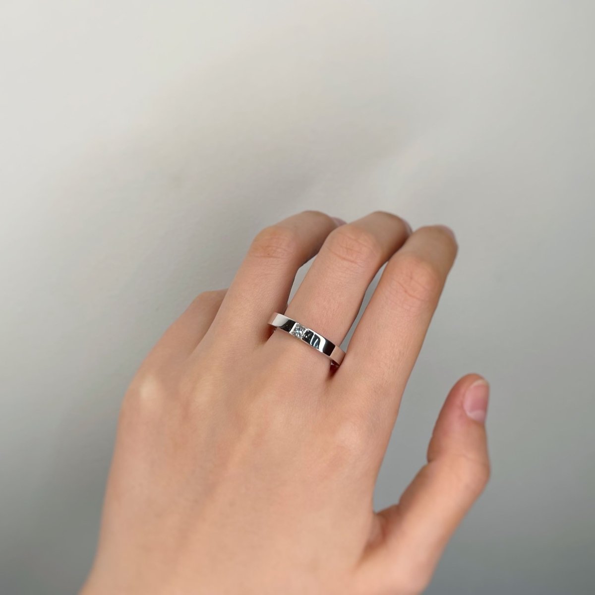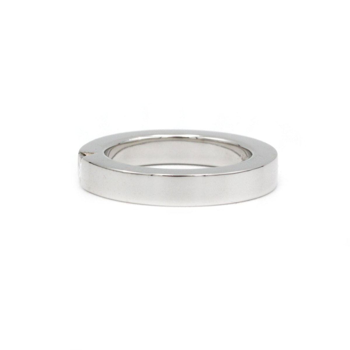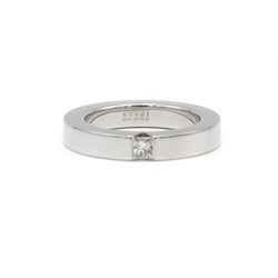 Bague signée GUCCI en or blanc 750‰, sertie d'un diamant taille princesse de 0,15 carat, G VS. Tour de doigt : 53 Mise à taille impossible. Poids : 10,73 grs
