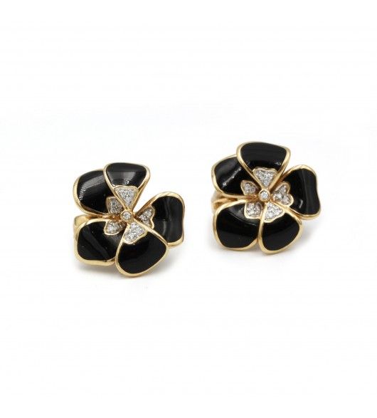 Paire de boucles d'oreilles en forme de fleur. en or jaune 750. les pétales sont recouvertes de laque noir et d'un pavage de diamants.