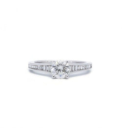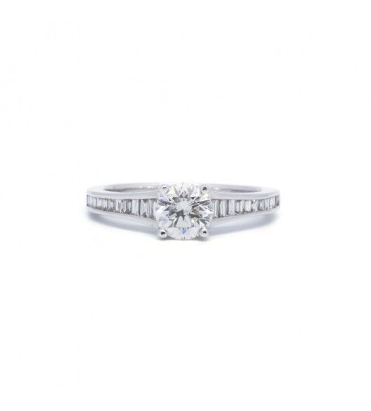 Solitaire en or blanc 750. serti d'un diamant taille brillant qualité H/Piqué de 0.83 carat. accompagné de 22 diamants taille baguette.Tour de doigt : 54Mise à taille impossible.