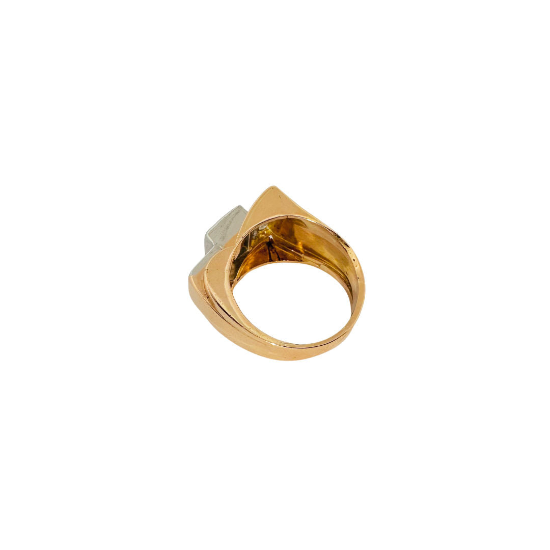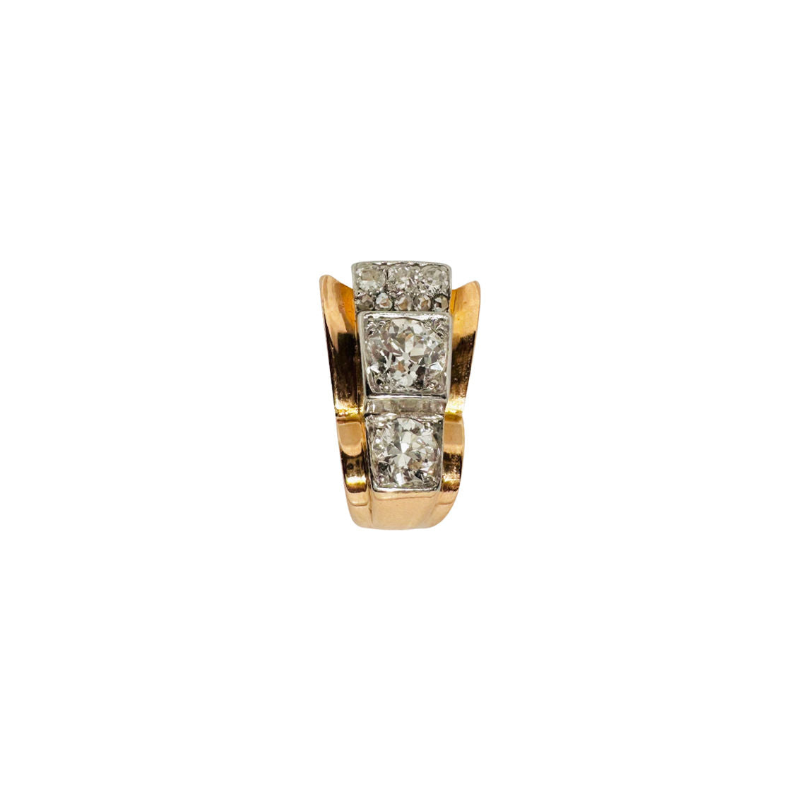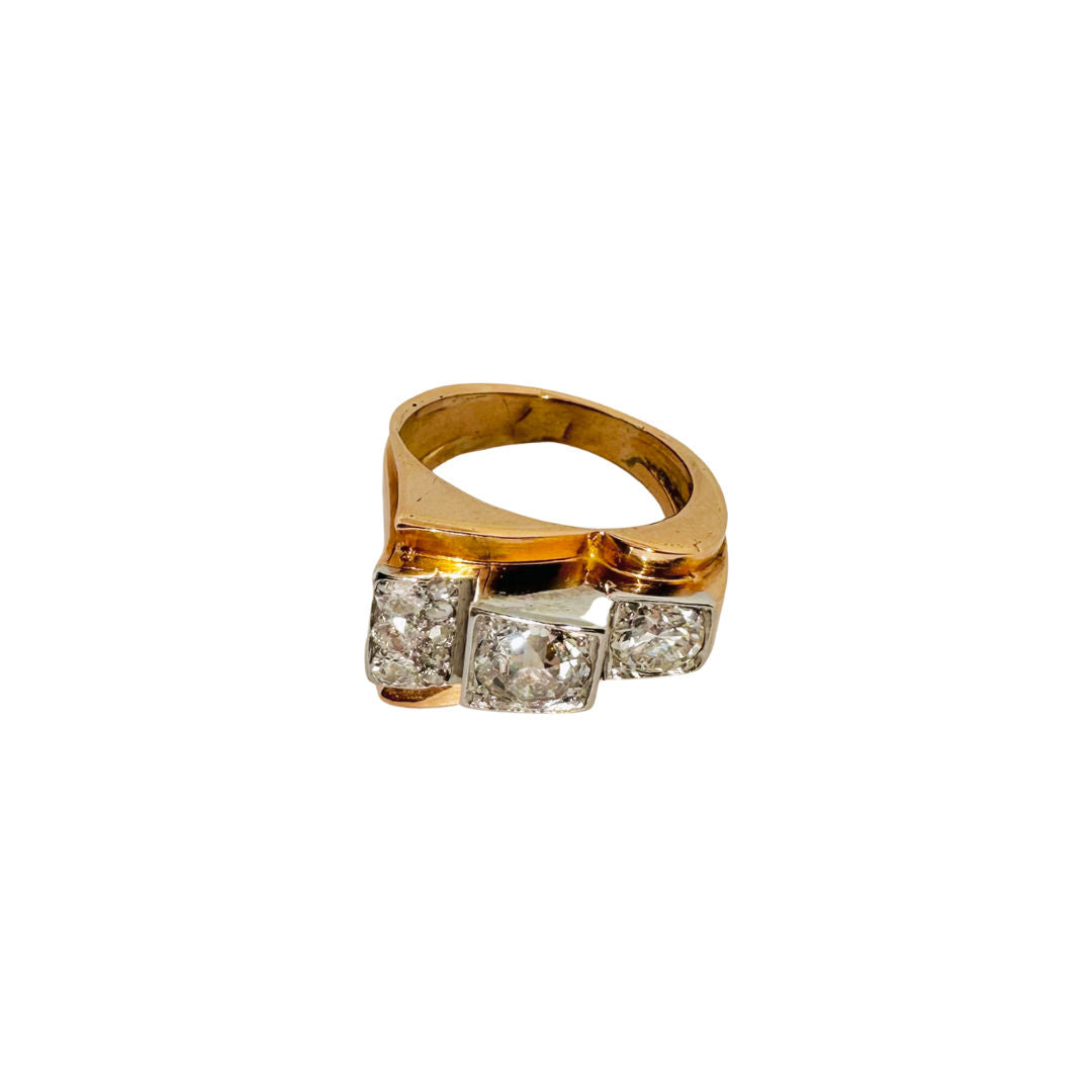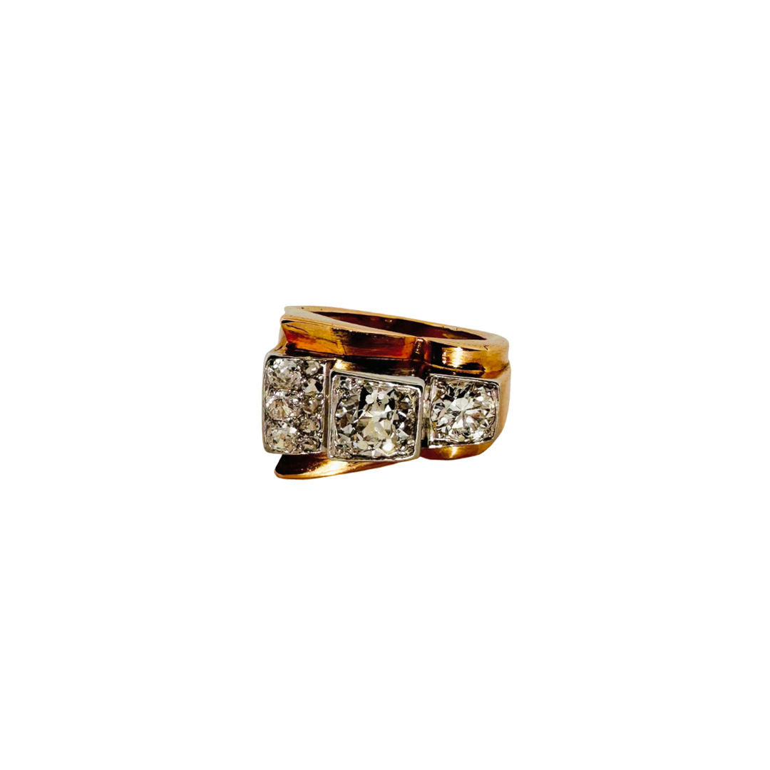 Bague "Tank" en Or jaune 18 Carats sertie d'un Diamant taille ancienne d'un Carat (VVS1-G) en son centre épaulée d'une part, d'un Diamant (environ 0.60 cts VVS1-I) et de l'autre part deux rangées de Diamants (environ 0.30 cts). Caractéristiques: Métal : Or jaune 750/1000 Pierres : Diamants (1.9 Cts environ) Poids : 7.6g Taille : 54 État: BonLes bijoux provenant de Passage Paris ont été soigneusement expertisés et remis en condition avant d'être proposés à la vente.