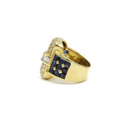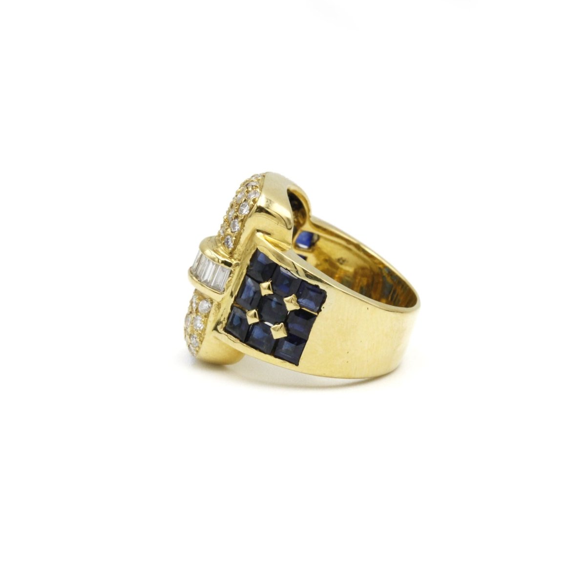 Bague en or jaune 750‰ en forme de boucle de ceinture pavée de saphirs taille princesse et de diamants taille brillant et taille baguette. Tour de doigt : 52 Mise à taille possible. Poids : 12,52 grs