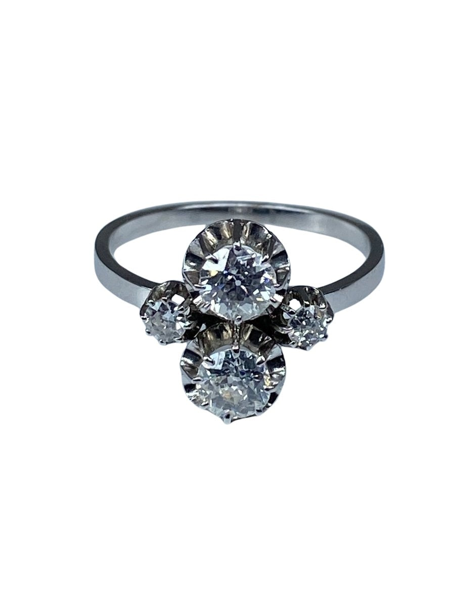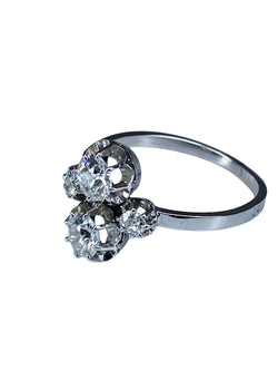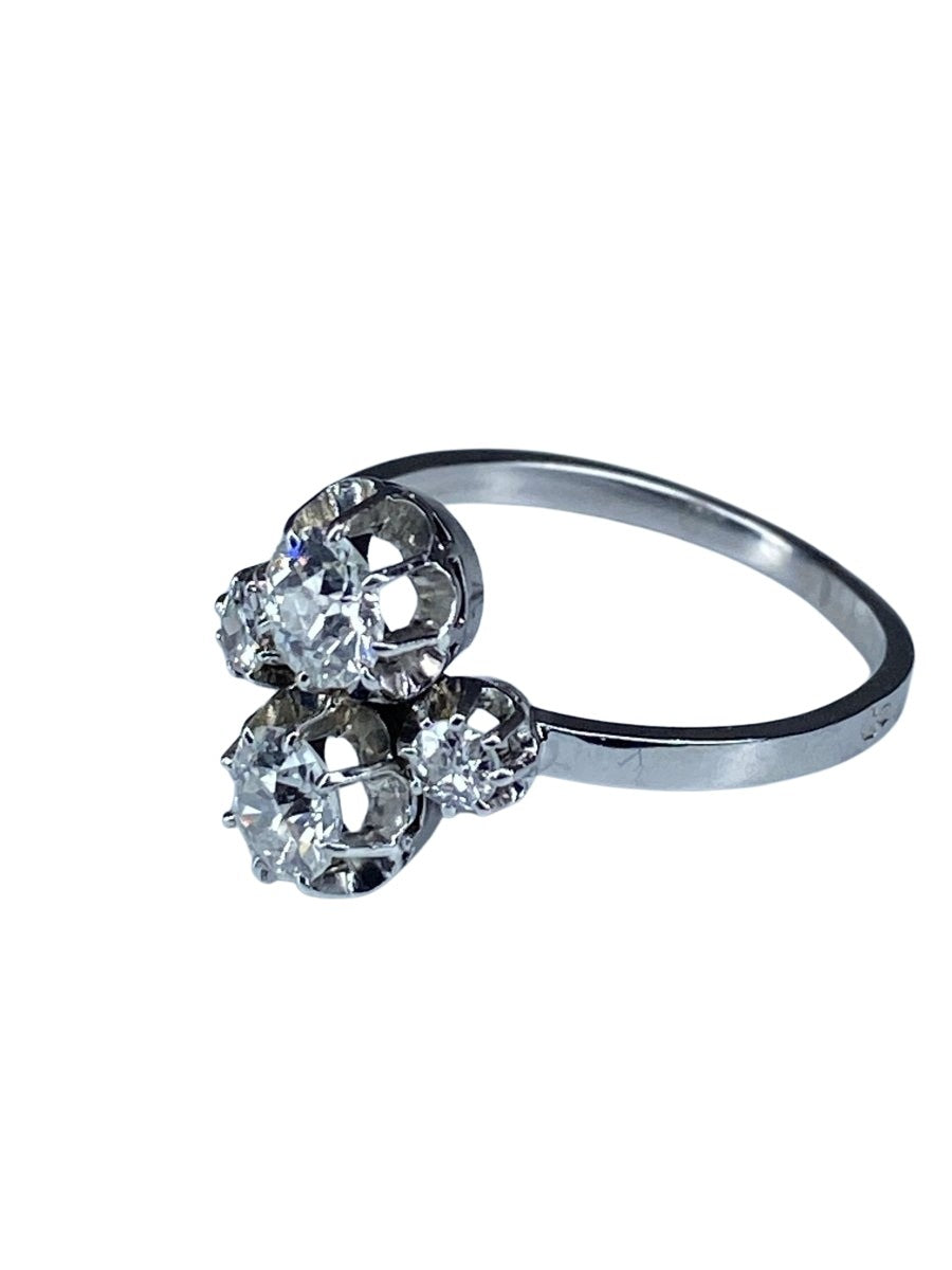 Bague TOI ET MOI en or 18 carats et platine ornée de 2 diamants de taille ancienne pesant chacun 0.50 carat environ, épaulés par 2 plus petits diamants de taille ancienne pesant chacun 0.10 carat environ. Epoque début 20eme siècle. poids :3.40 gr dimensions : profondeur 13.9 x largeur 12.7 mm Tour de doigt :56