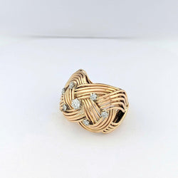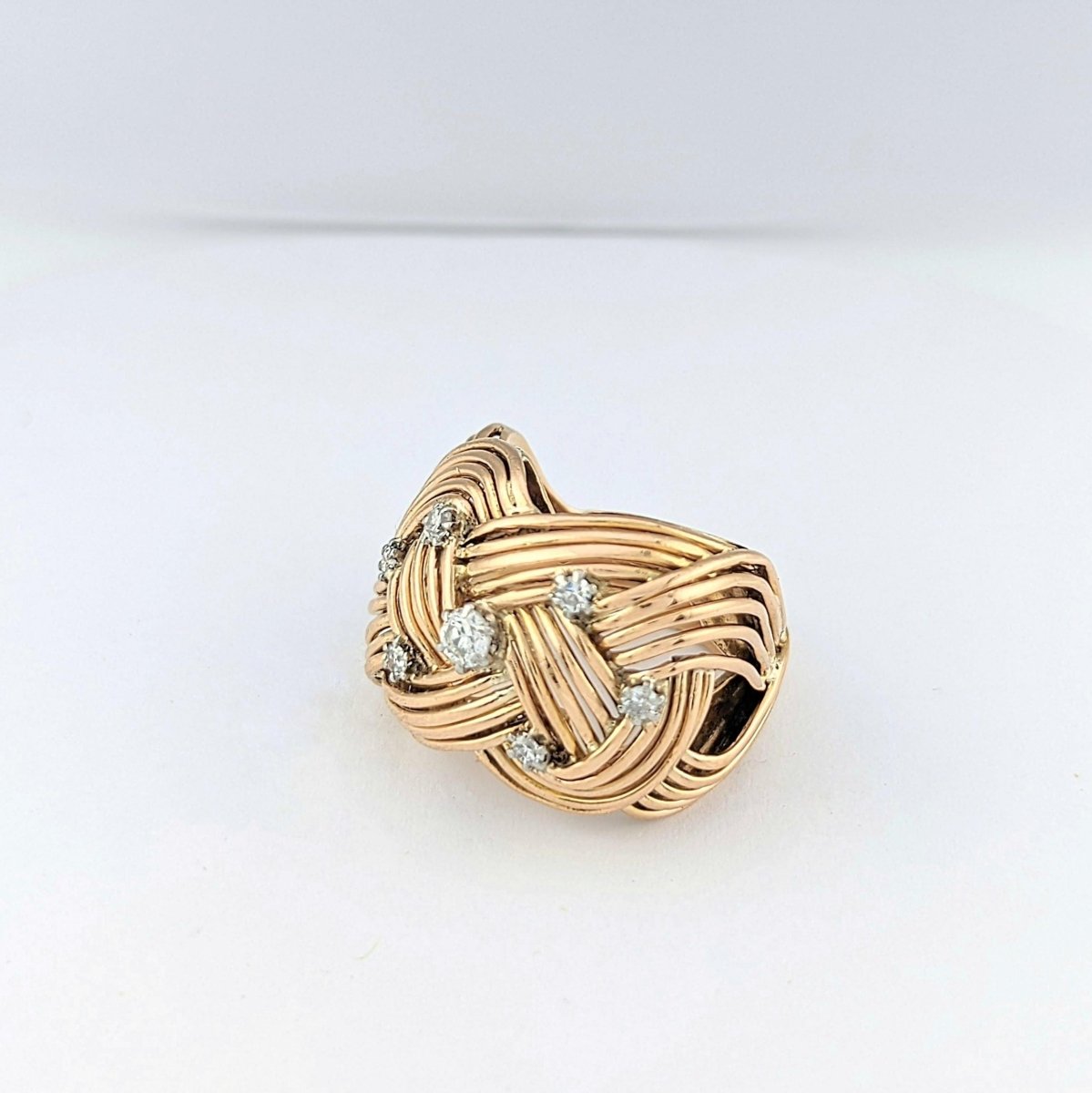 Bague en or jaune et diamants 18 carats - 750 millièmes Poids brut 12,46 gr Tour de doigt 54 mm Largeur du haut de bague 18,4 mm Epaisseur sur le doigt 6,5 mm Poids total moyen des diamants 0,23 carat