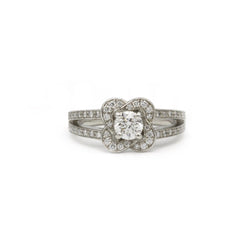 Bague en forme de fleur, en platine 950‰ sertie d'un diamant 0,46 carat E SI2 certifié GIA et de 48 diamants (0,35 carat). Tour de doigt : 53 Mise à taille possible. Poids : 7,83 grs