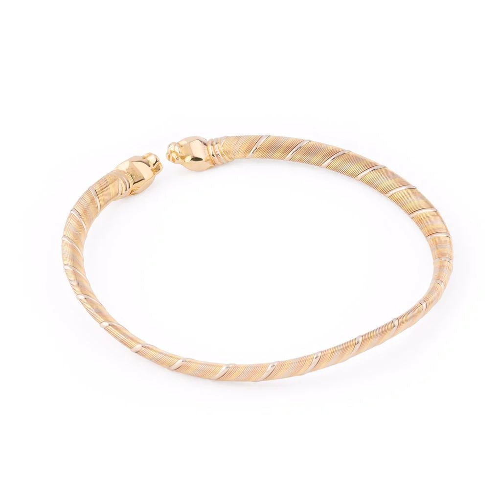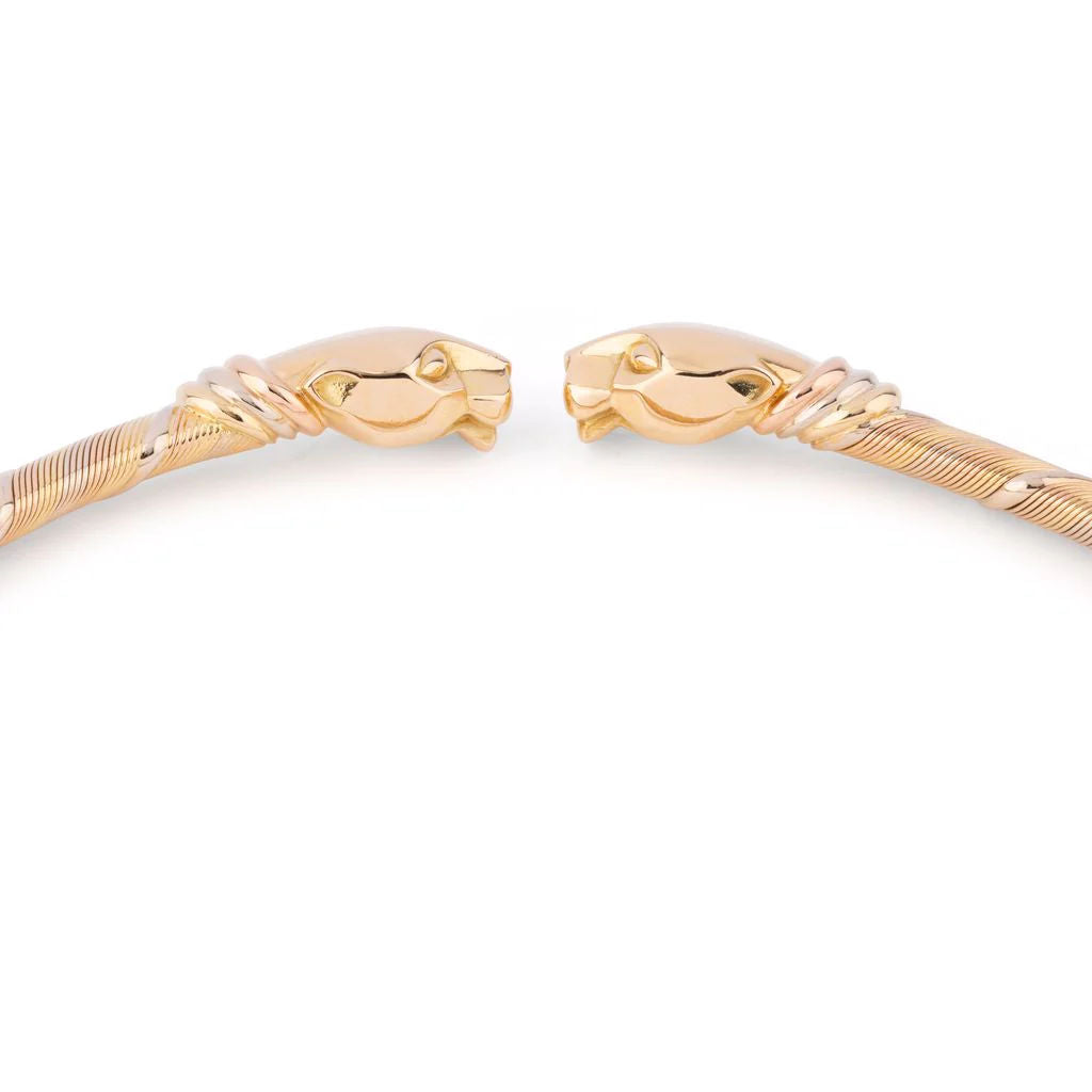 Collier Torque tubogaz signé de la maison CARTIER "Têtes de panthère" en or jaune, or blanc et or rose 750/1000 (18 carats), numéroté. Matière : or jaune, or blanc et or rose 750/1000 (18 carats) Diamètre : 12,5 cm Poids : 89 g Excellent état Époque : 1990