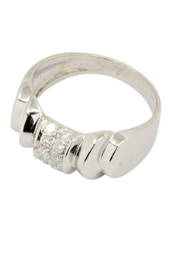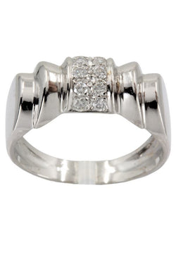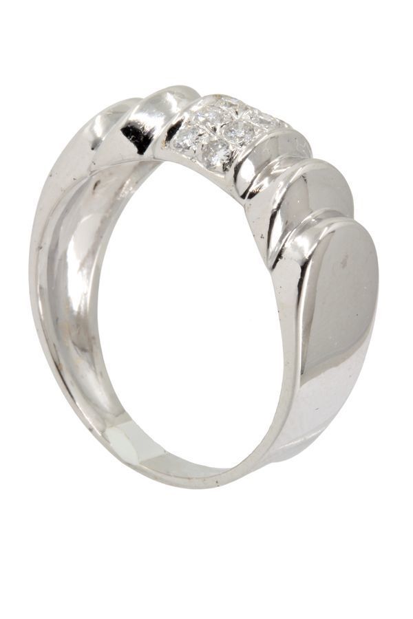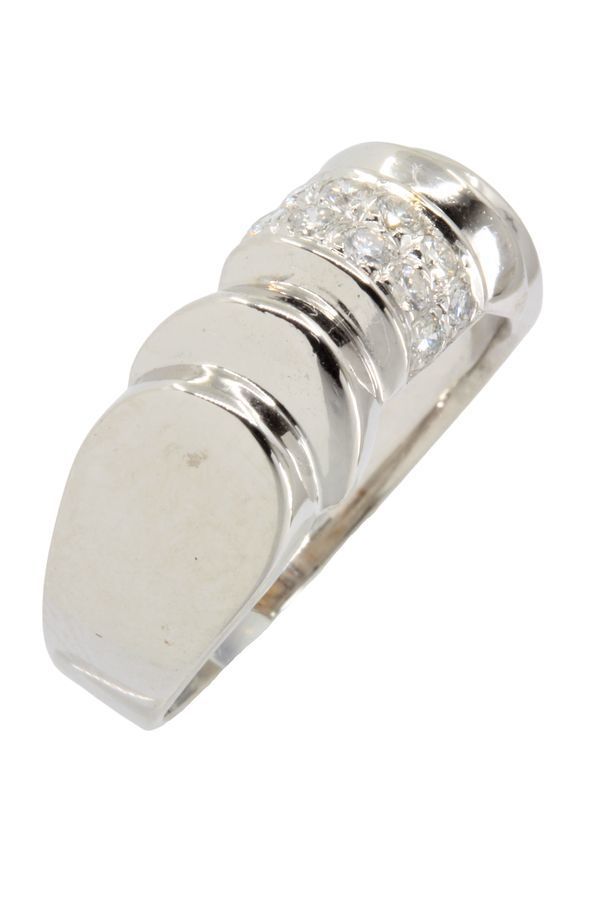 Cette bague moderne s'inspire des modèles appelés tank des années 40, elle est sertie de diamants. Métal : Or blanc 18 carats (750/1000) Poids : 5.1 g Pierre : Diamant Poids diamant : 10 x 0.04 carat Taille : 52 - Mise à la taille sur demande Poinçon : Tête d'aigle