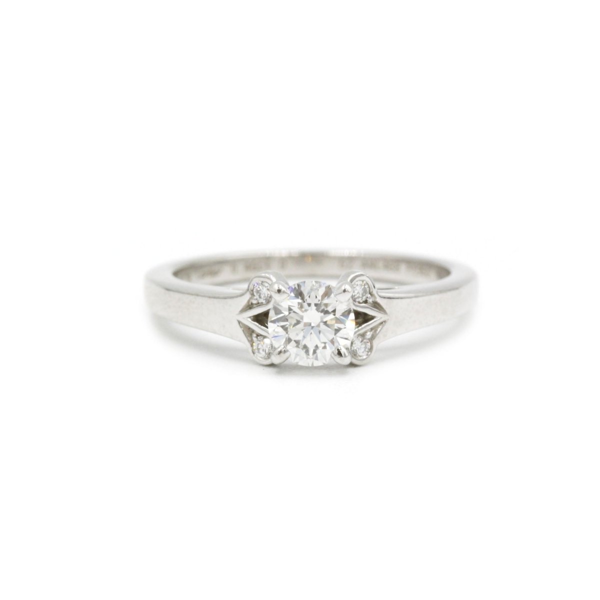 Bague Solitaire signée de la maison CARTIER, modèle "Ballerine" en platine 950 millième serti d'un diamant de 0.46 carat entouré de 4 petits diamants. Tour de doigt : 52