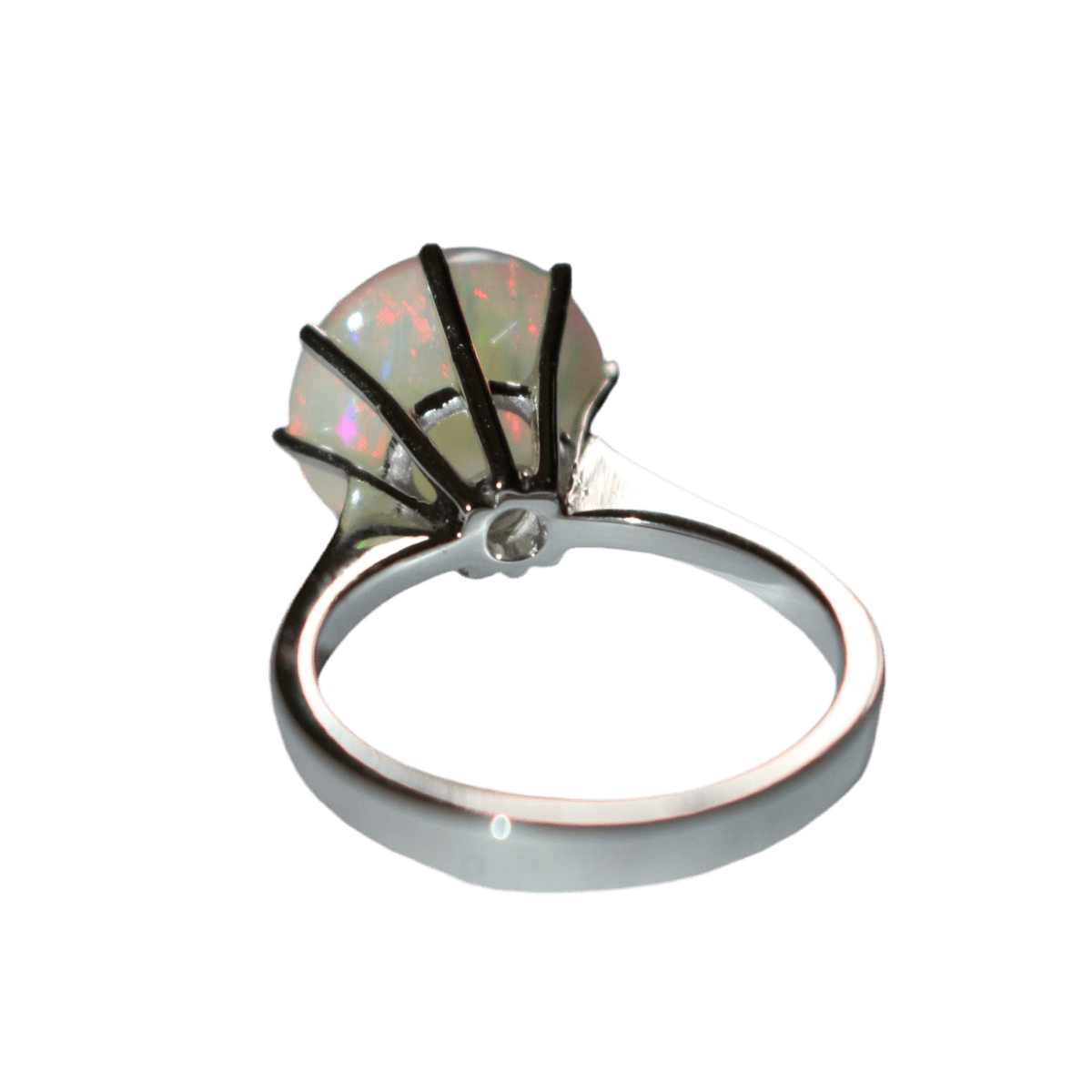 Bague en or blanc 18 carats ornée d'un cabochon d'opale serti griffes, épaulé de 4 petits diamants taille brillant de chaque côté