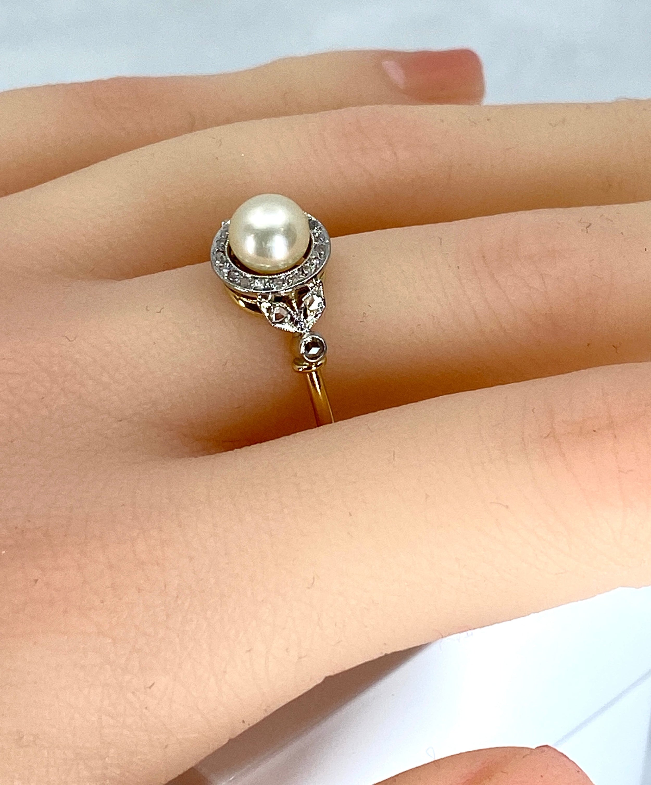 Bague en or 18 carats ornée au centre d'une perle entourée d'une ligne de diamants de taille ancienne. Ce cercle diamanté est épaulé par 2 petites feuilles serties également de diamants taillés en rose. Epoque 1900, parfait état, travail français. Poids : 3.60 gr Dimensions : profondeur 9.8 x largeur 7.9 mm ( de diamants à diamants)
