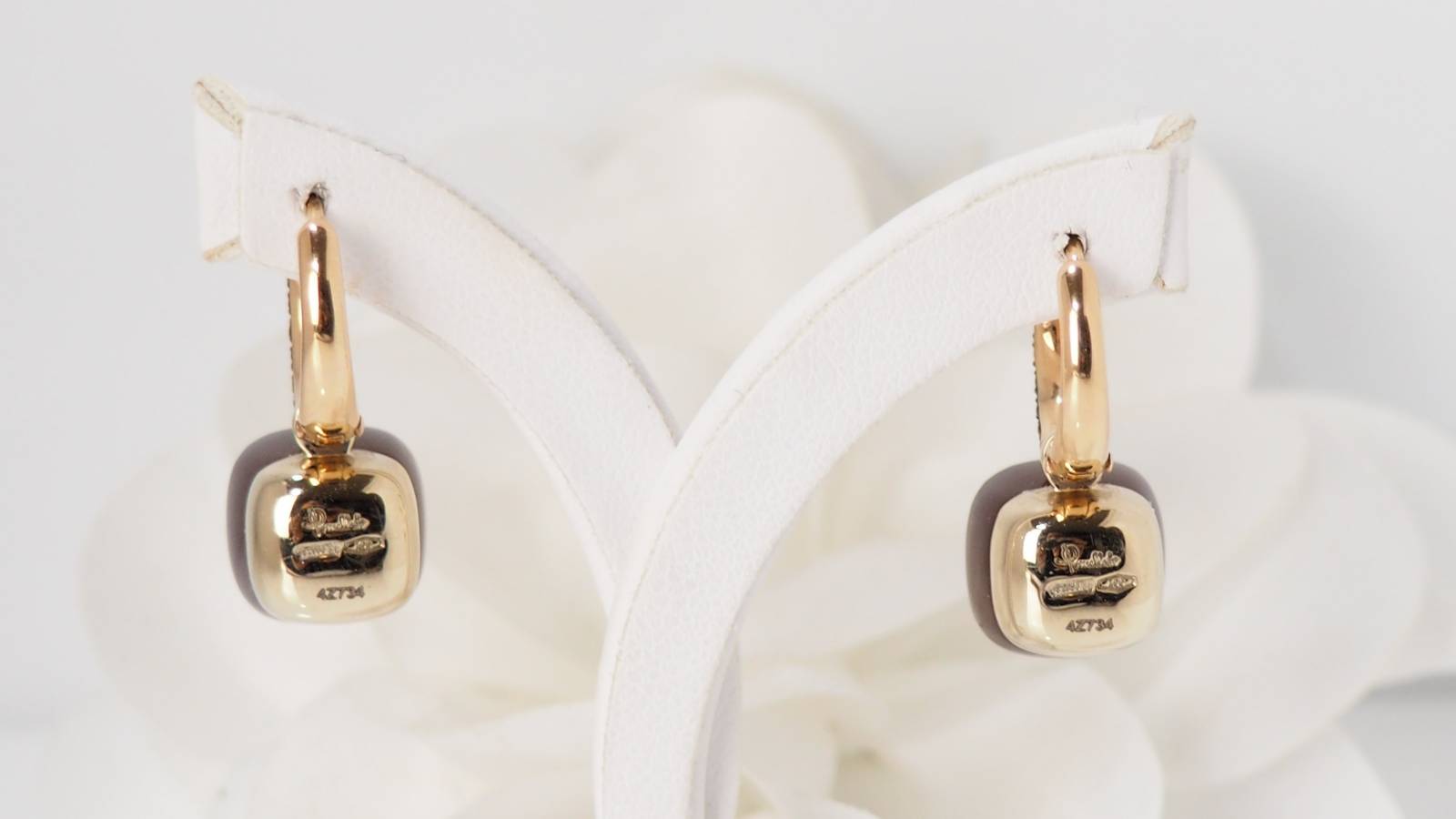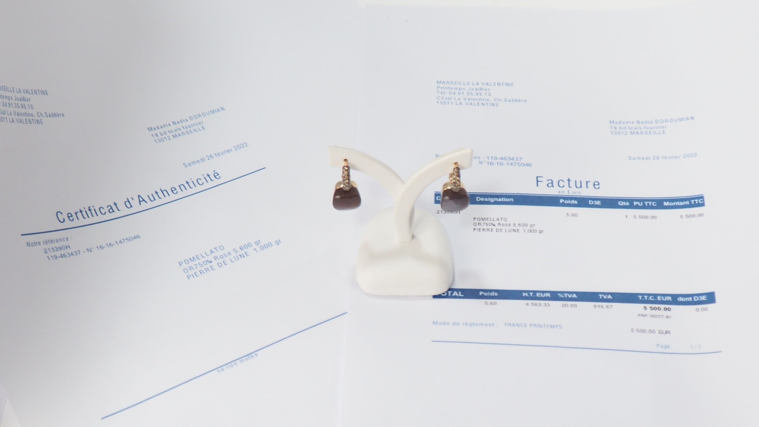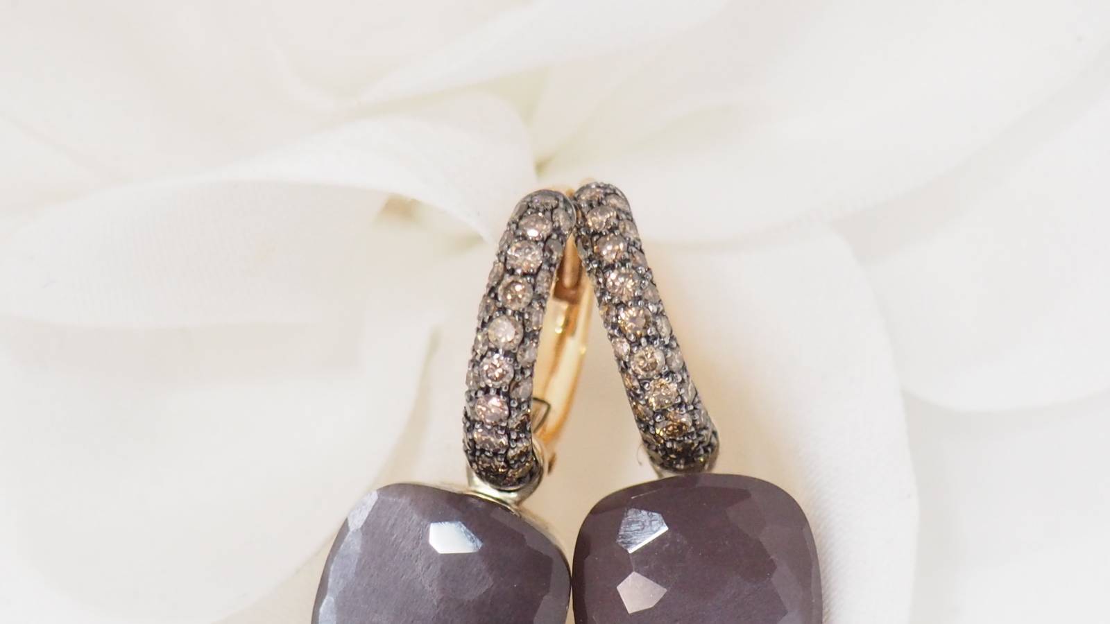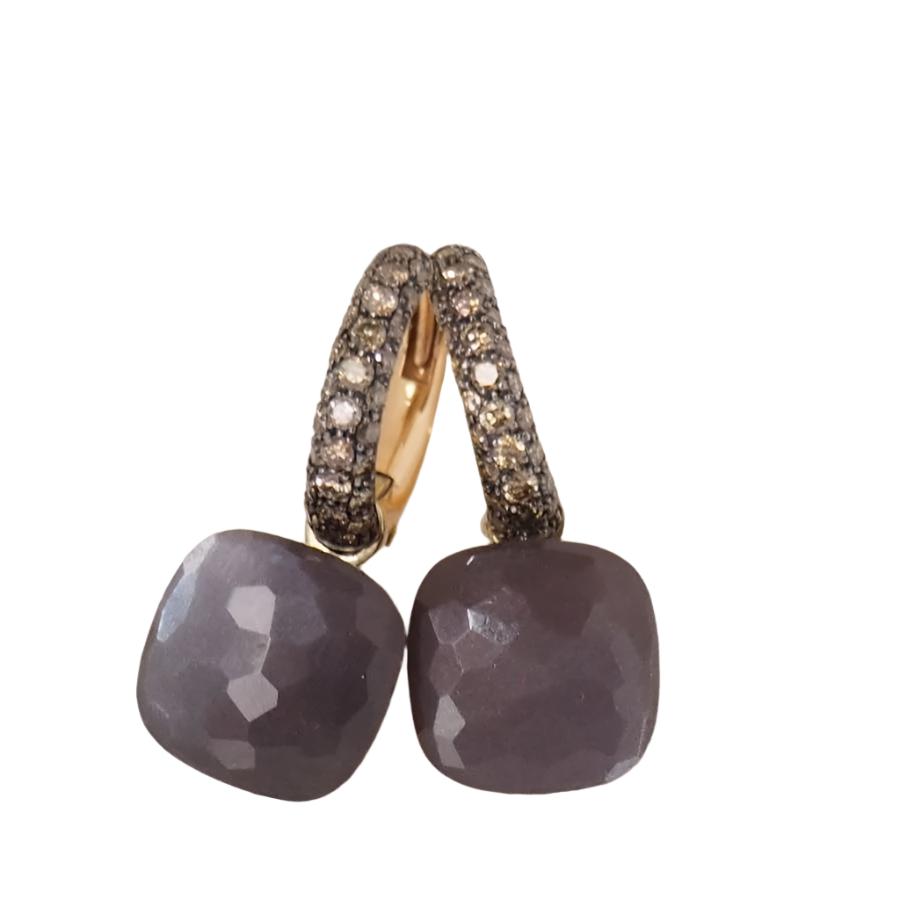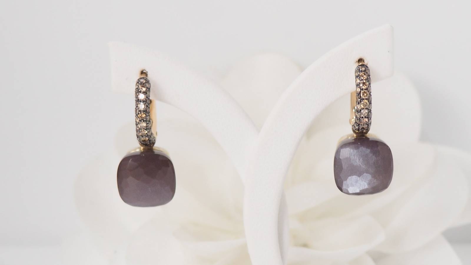 Boucles d'oreilles ; Marque : Pomellato ; Modèles : Nude Chocolate ; Or rose 18 kt / 750 millièmes ; Ornées de pierre de Lune 14,50 ; Serties de diamants bruns pour un poids total d'environ 0,50cts ; 8,53g ; Vendues avec facture et certificat.