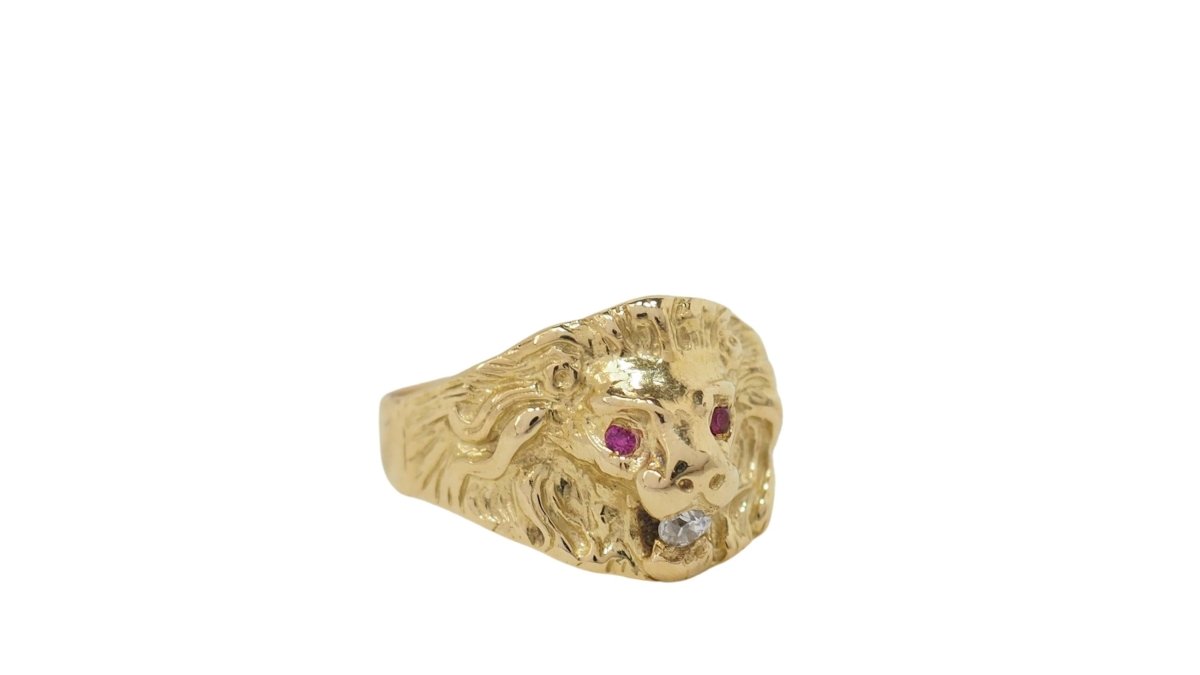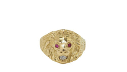 Bague chevalière Lion Or jaune 18kt Les yeux incrustés de rubis Diamant taille brillant 0,10ct Poids : 8,40gr Taille 64