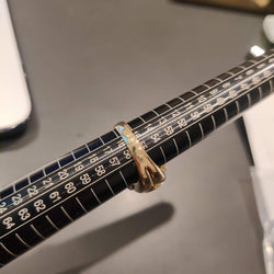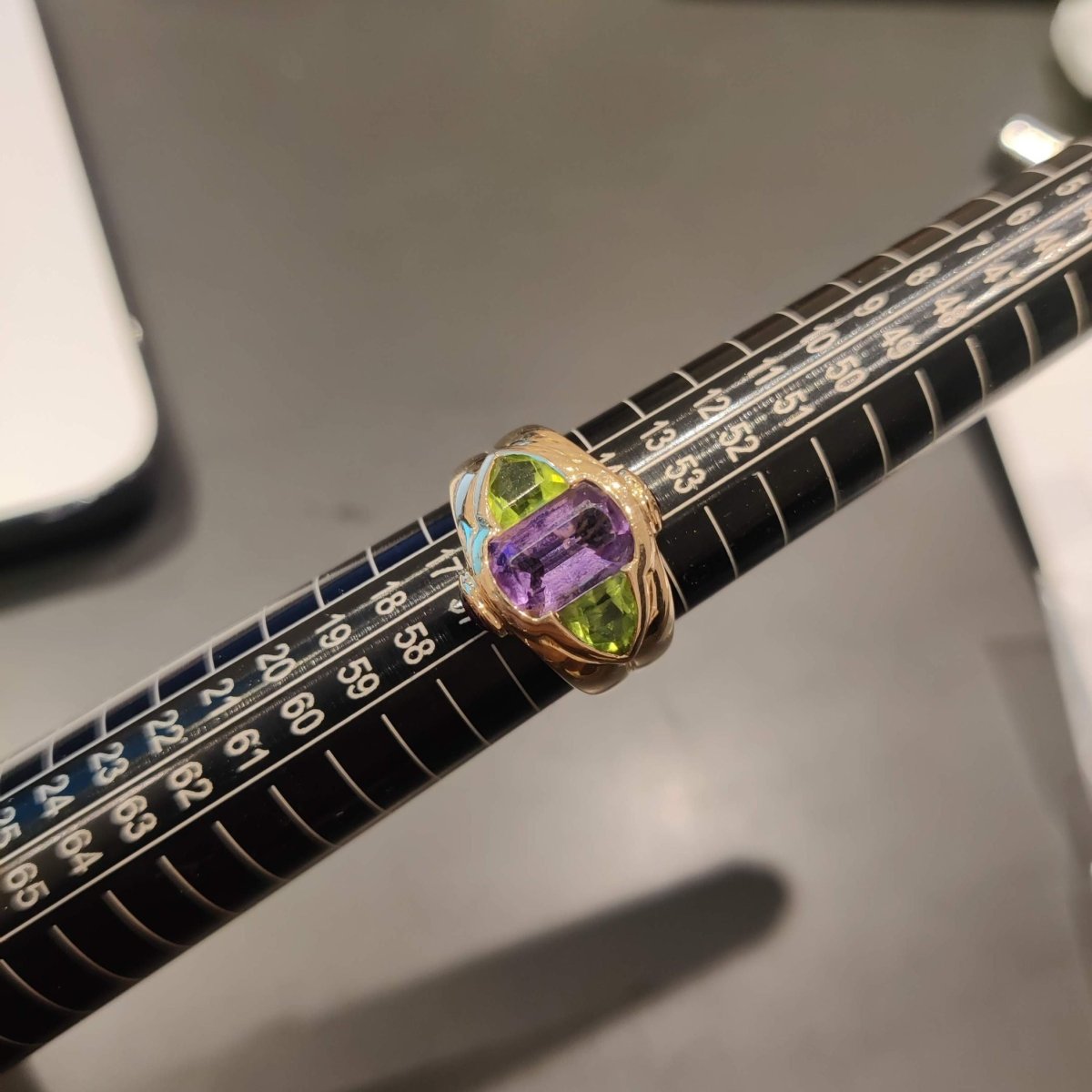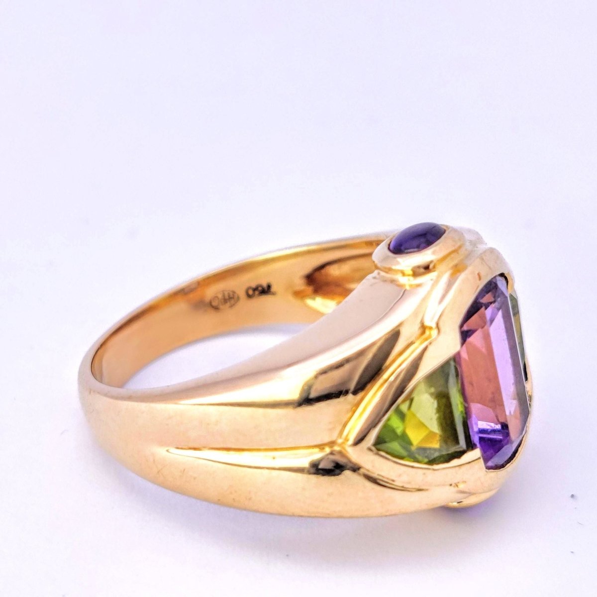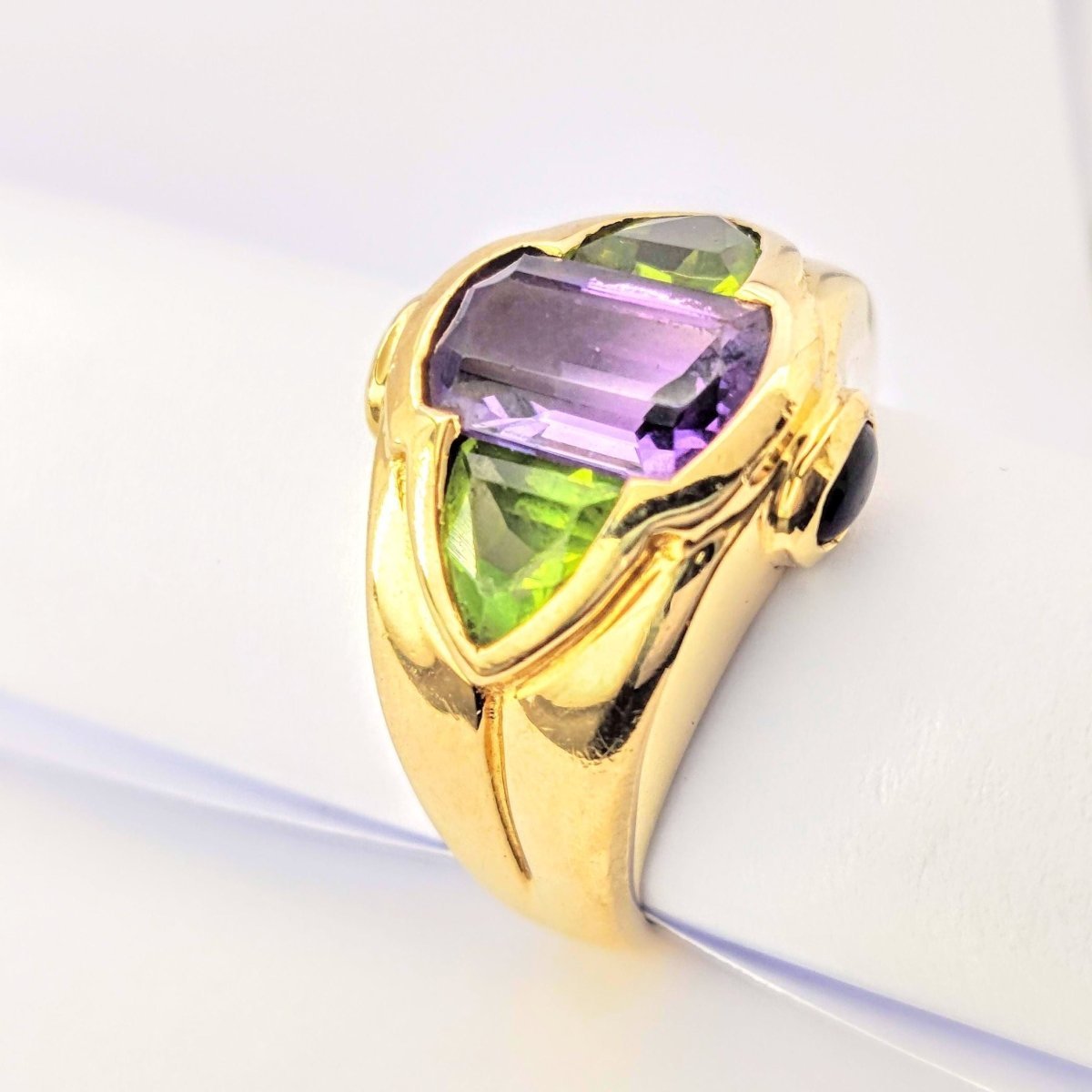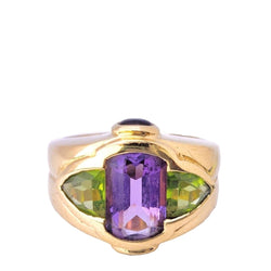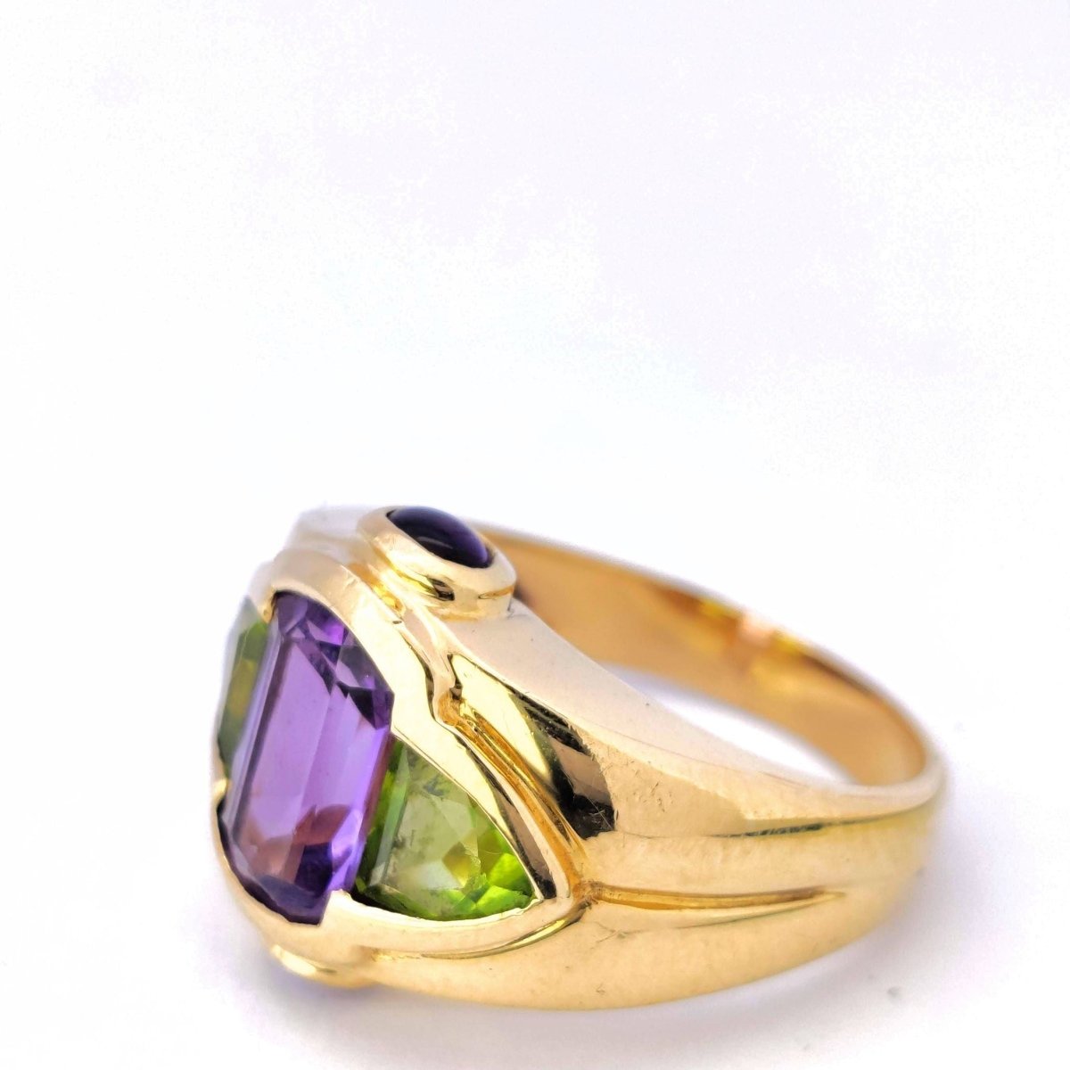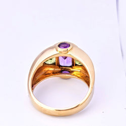 Bague en or jaune 18 carats - 750 millièmes, améthyste et péridots Poinçon 750 Taille de doigt 56 Largeur du haut de bague 1,5 cm Poids brut 9,4 gr Poli(e), Authenticité et qualité contrôlée, Remis(e) à neuf