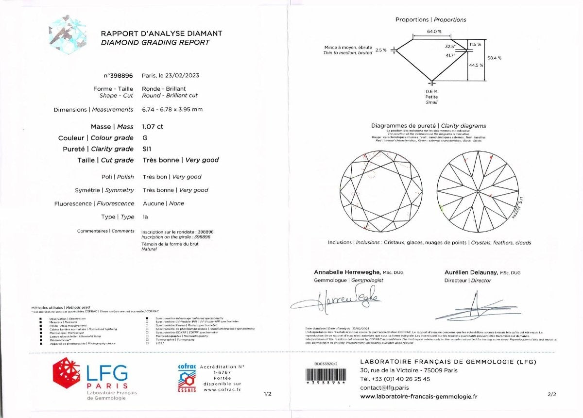 Solitaire en or blanc 750‰, serti d'un diamant de 1,07 carats G SI1 certifié du Laboratoire Français de Gemmologie et de 2 diamants poires de 0,20 carat chacun environ. Tour de doigt : 53 Mise à taille possible. Poids : 3,07 grs