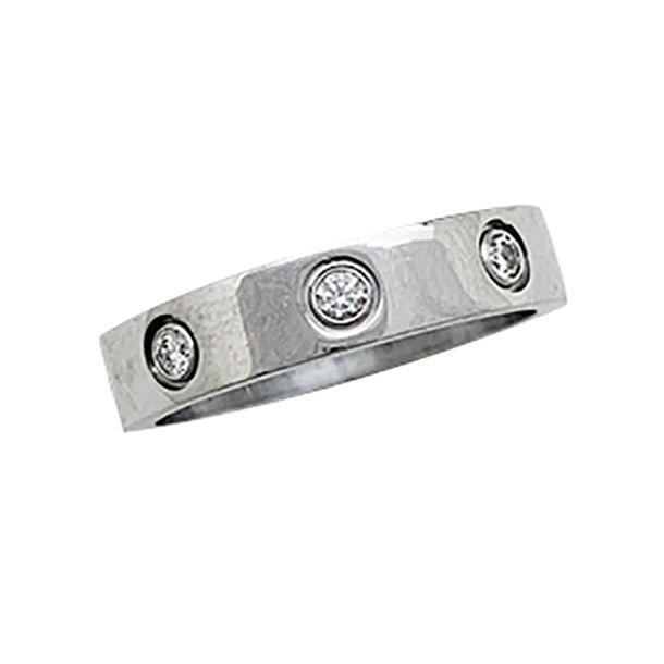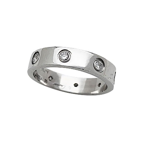 Une bague signée de la Maison Cartier, modèle “Love”, sertie de 8 diamants taille brillant. Largeur : 4 mm Poids : 4.4 grammes Poids du diamant : 0.19 carat Prix neuf : 4100 Tour de doigt : 50