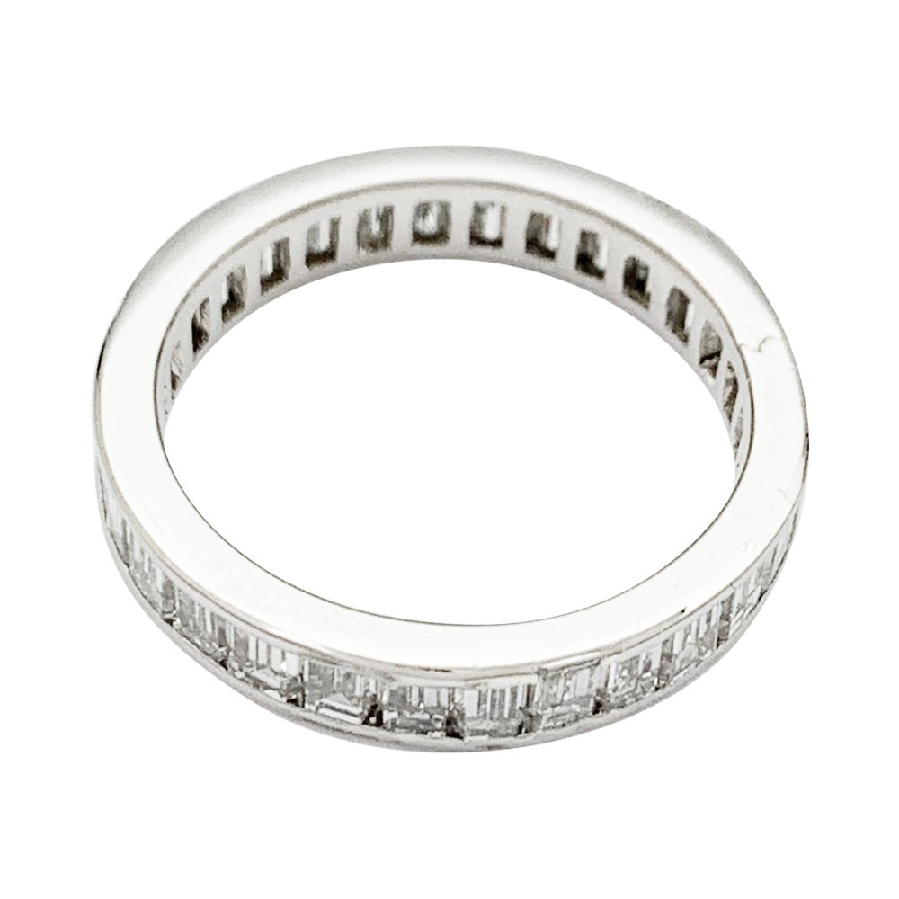 Une alliance tour complet en platine 950/000 sertie de diamants taille baguette. Largeur : 3,5 mm Poids : 4,1 grammes Tour de doigt : 54