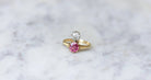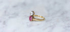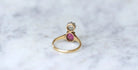 Bague de fiançailles aigrette en or jaune 18Kt et platine, dont le motif central est orné d'une rubellite (tourmaline) ovale pesant environ 1.00 Ct, surplombée d'un diamant taille ancienne pesant environ 0.50 Ct (couleur estimée I, pureté estimée P) Travail de la fin du XIXe / début du XXe Siècle, Edouardien, Circa 1900. Poids brut: 3,47gHauteur du motif: 1,50 cmLargeur du motif: 0,70 cm Tour de doigt: 55 (diamètre 17,50 / US 7,25). État: légères micro rayures sur les parties or et platine, légère usure du serti, inclusions naturelles dans les pierres, très légers chocs sur le rondiste du diamant, voir photos. Faire le choix d’une bague de fiançailles ancienne, c’est porter à son doigt une pièce unique, un petit trésor, comme votre histoire d’amour. Toutes nos bagues de fiançailles.