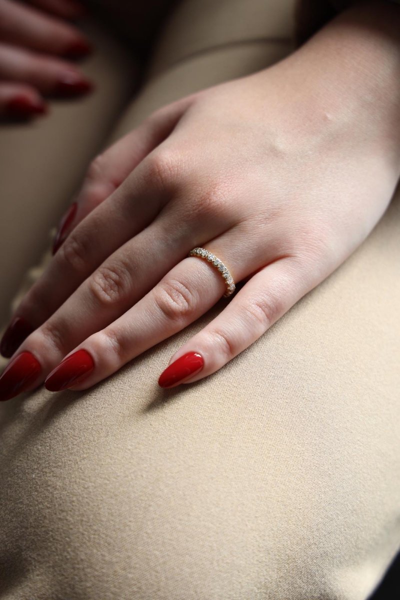 Alliance tour complet en or jaune 750 millièmes (18 carats). sertie de 23 diamants taille brillant. d'environ 0.035 ct chacun. poids total diamants: environ 0.805 ct. largeur sur le dessus: 0.31 cm. tour de doigt: 47. poids total: 2.56 g. poinçon tête d'aigle. excellent état